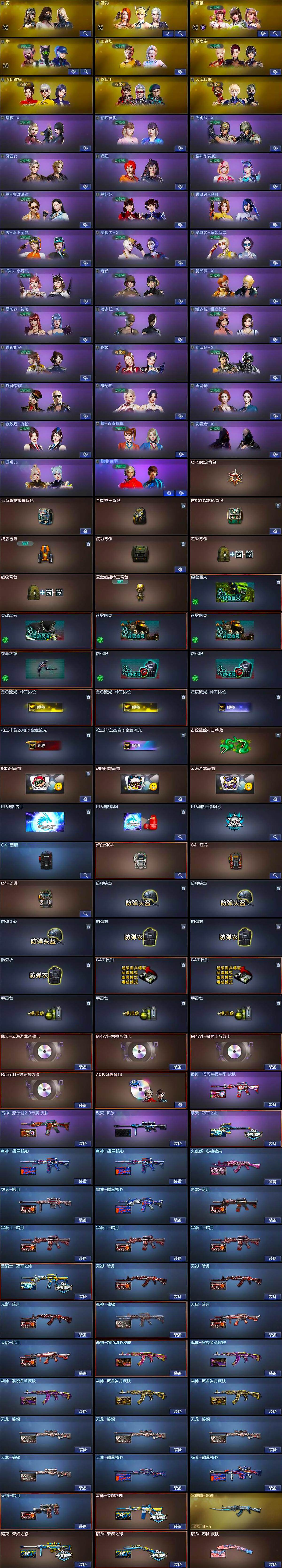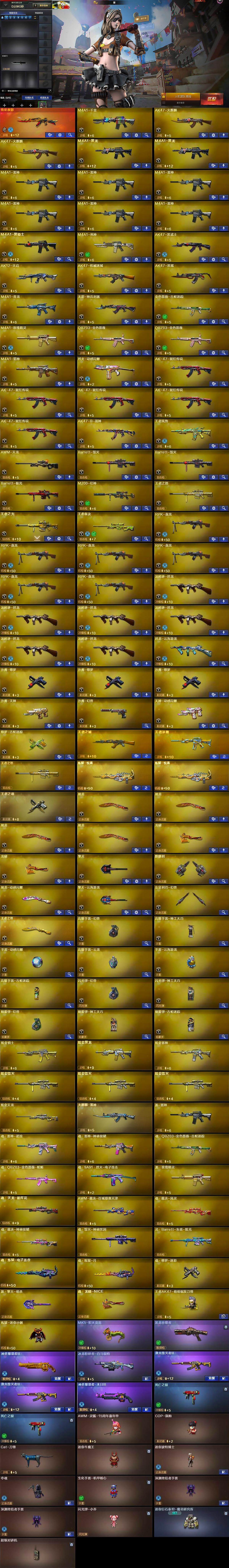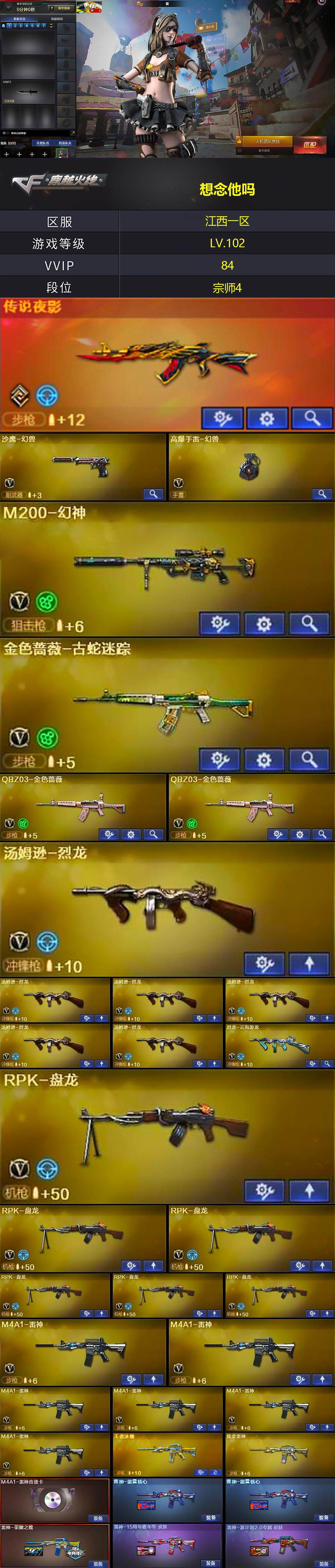 【热门武器】:传说夜影,QBZ03-金色蔷薇*2,M4A1-青龙,M200-幻神,金色蔷薇-古蛇迷踪,修罗-古蛇迷踪,死亡之眼*2,Cat-刀锋,炼狱-迷你小钢,M4A1-黑骑士,汤姆逊-烈龙*6,RPK-盘龙*6,MK5-炽火炎龙,王者AK47-萌萌银发刀锋,沙鹰-修罗*3,黄金猫猫手套-白鲨,金刚伞,高爆手雷-幻兽