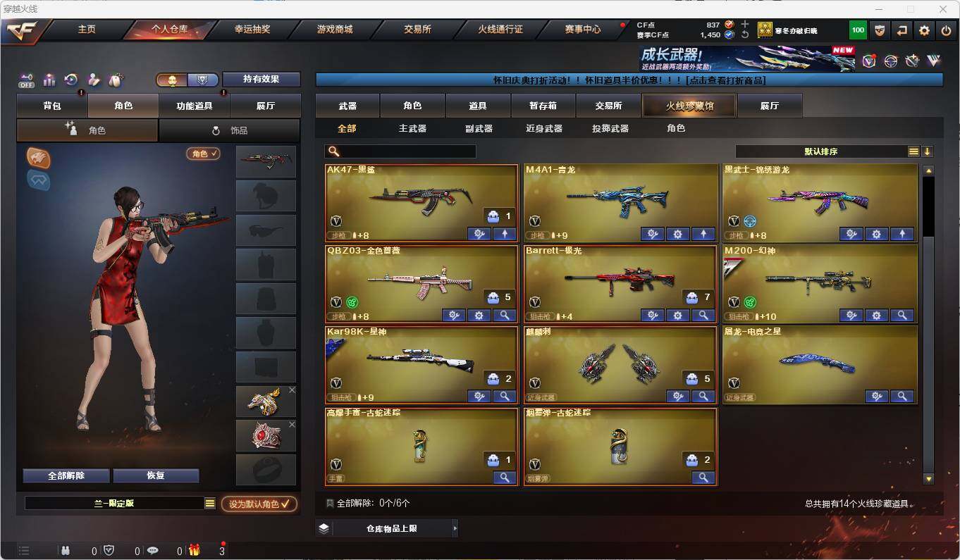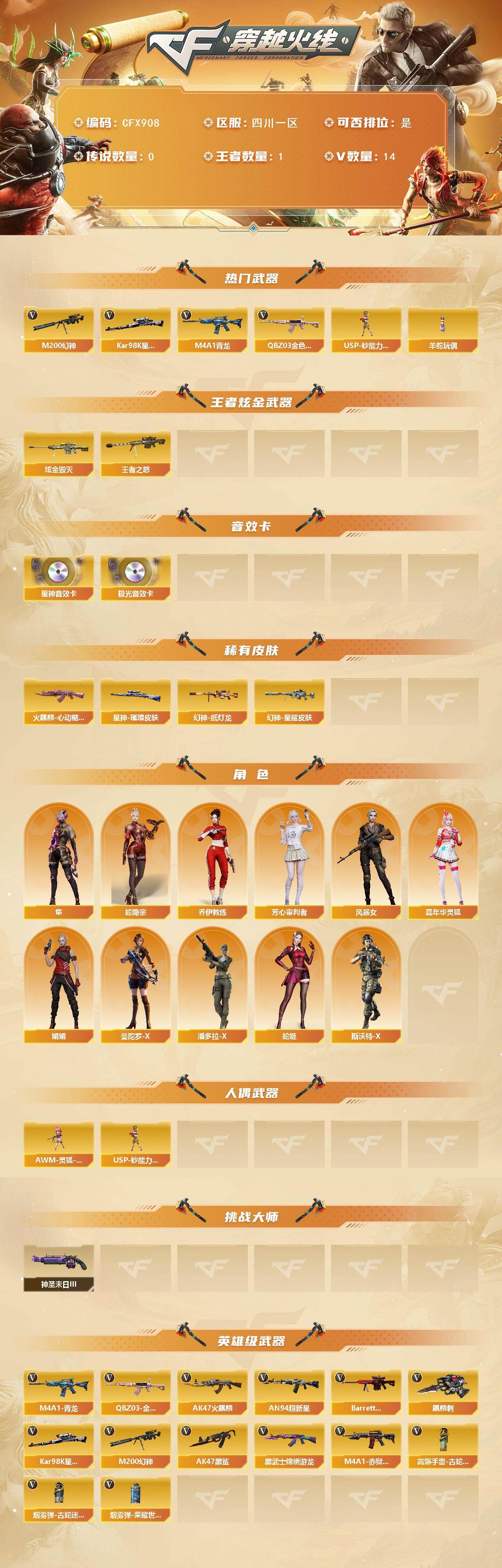 【CFX908】12V/88级/将帅/1王者/1炫金/2英雄/QBZ03-金色蔷薇/M4A1_青龙/M200_幻神/98K_星神/USP-钞能力灵狐/羊驼玩偶/王者之怒/炫金毁灭/Barrett-极光音效卡/Kar98K-星神音效卡/幻神-星耀 皮肤/幻神-纸灯龙皮肤/星神-璀璨皮肤/火麒麟-心动糖果/隼/蛇隐宗/乔伊教练/芳心审判者/风暴女/嘉年华灵狐/娟娟/曼陀罗-X/潘多拉-X/蛇姬/斯沃特-X/AWM-灵狐-15周年嘉年华/神圣爆裂者-末日III/AK47火麒麟/AN94_超新星/AK4