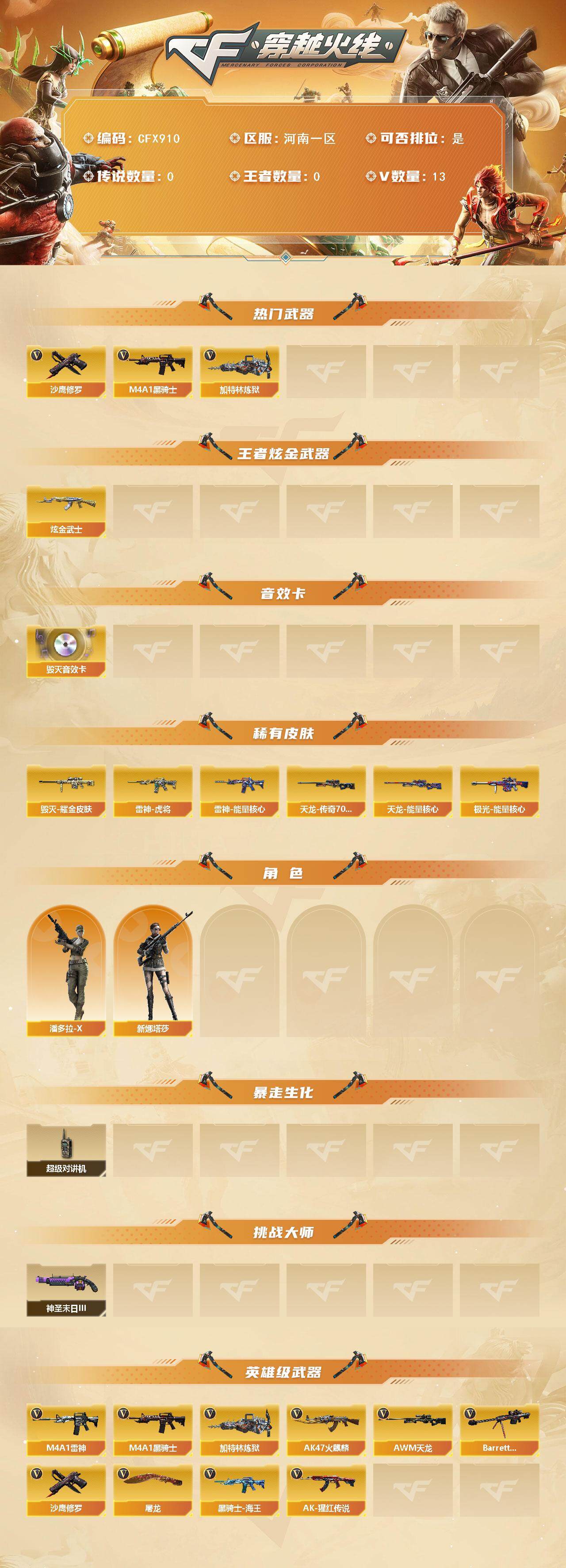 【CFX910】13V/100级/元帅/1炫金/M4A1_黑骑士/加特林_炼狱/沙鹰_修罗/炫金武士/Barrett-毁灭音效卡/雷神-能量核心/雷神-虎将/毁灭耀金皮肤/天龙-能量核心/AWM-天龙-传奇70KG/极光-能量核心/潘多拉-X/新娜塔莎/超级对讲机/神圣爆裂者-末日III/AK47火麒麟/M4A1_雷神/AK-47-猩红传说/黑骑士-海王/AWM_天龙/Barrett-毁灭/屠龙/超级背包/夺命之镰/防化服/防弹头盔/防弹衣/C4工具钳/手雷包