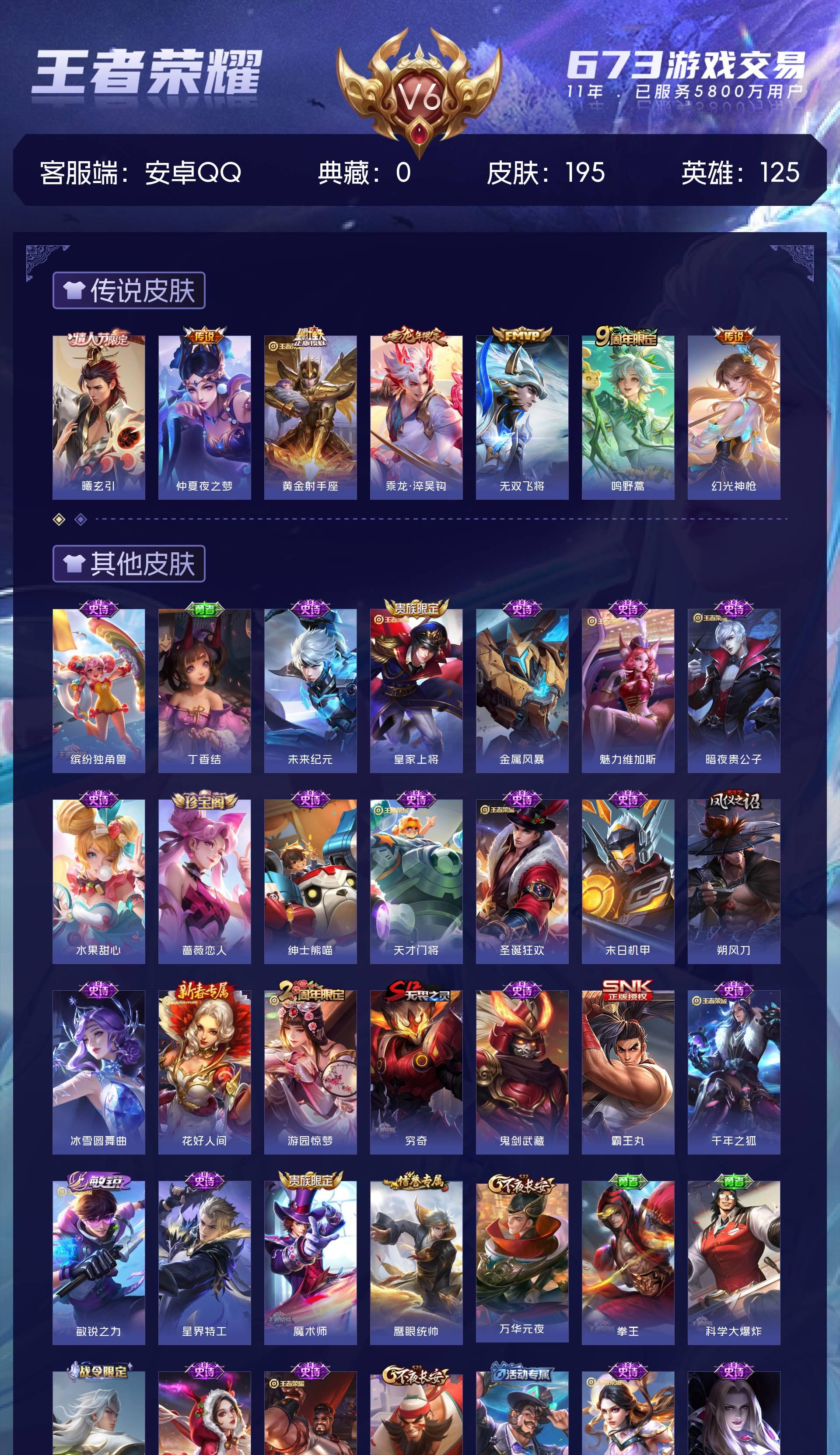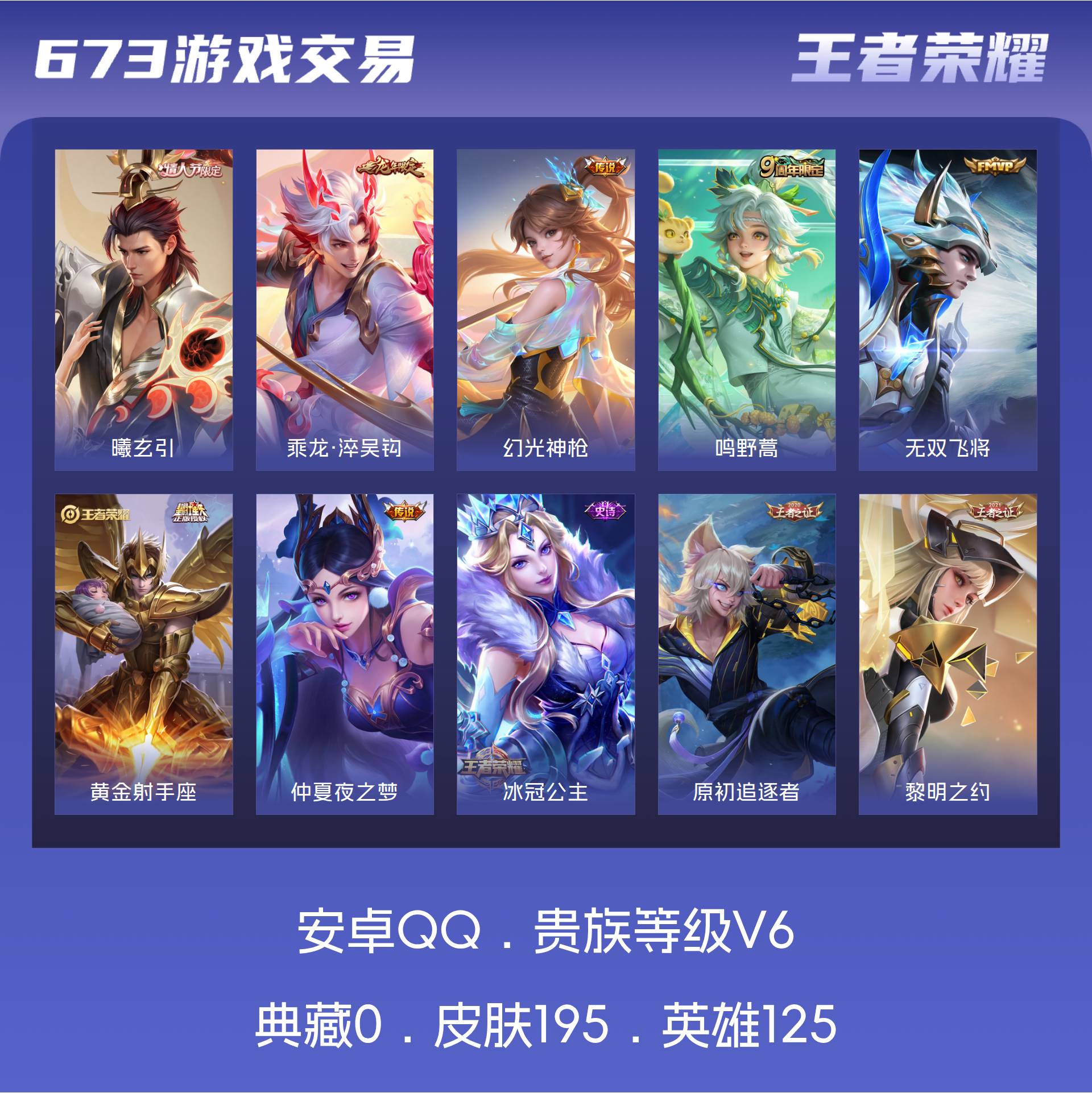 264-【195皮肤1星元7传说可秒换绑】安卓QQ-125英雄-195皮肤【星元皮肤】金色仲夏夜【传说皮肤】乘龙·淬吴钩 曦玄引 鸣野蒿 幻光神枪 无双飞将 仲夏夜之梦 黄金射手座【史诗皮肤】荣光圣徽 龙之律动 百相守梦 顽趣 青焰无极 魅语 繁星吟游 功夫厨神 魅力维加斯 魔术师 鹰眼统帅 圣诞恋歌 鬼剑武藏 水晶猎龙者 修罗 曙光守护者 暗隐猎兽者 千年之狐 德古拉伯爵 绅士熊喵 天才门将 紫霞仙子 圣诞狂欢 末日机甲 金属风暴 梁祝 李小龙 水果甜心 蔷薇恋人 偶像歌手 缤纷独角兽 冰冠公