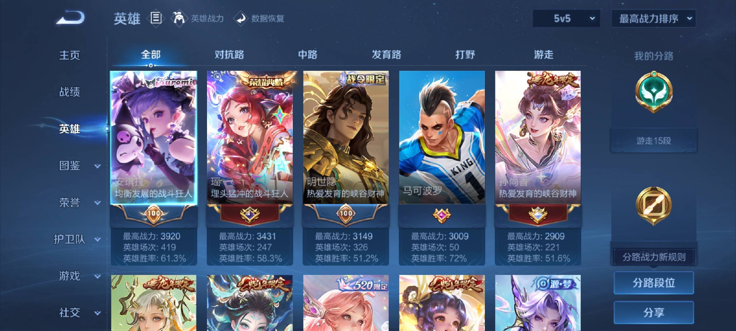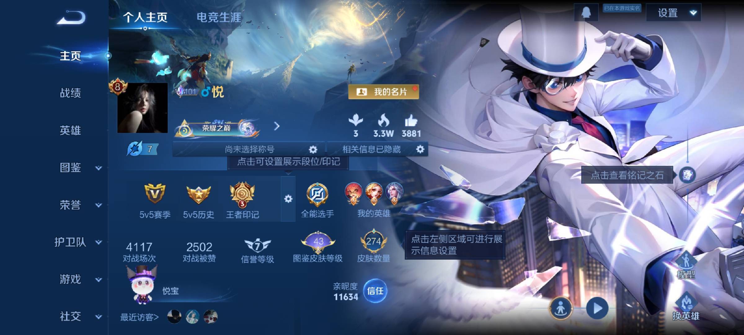 安卓QQ/永恒钻石/274皮肤/126英雄/2典藏/0珍品无双/0无双/5珍品传说/13传说/83史