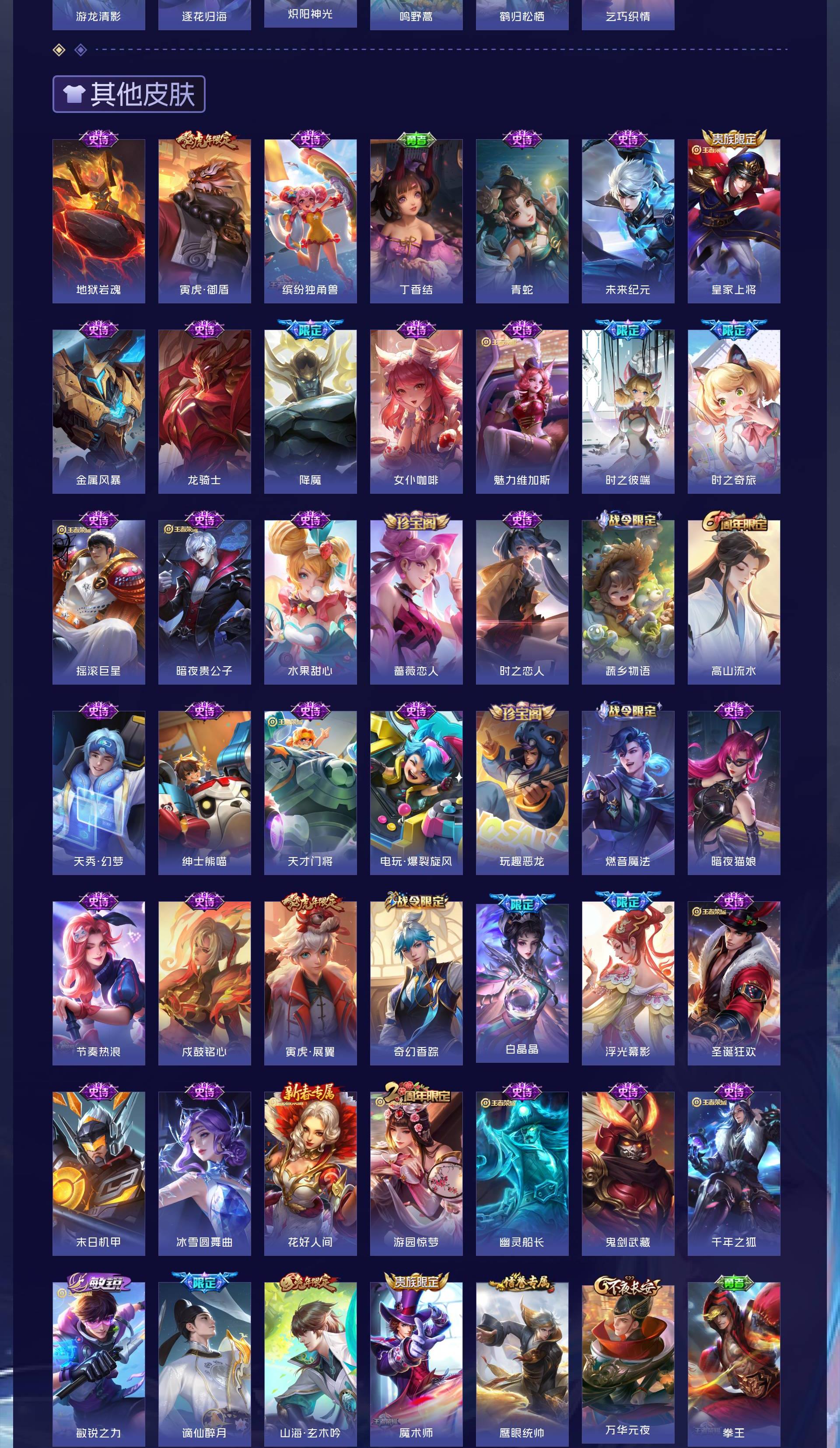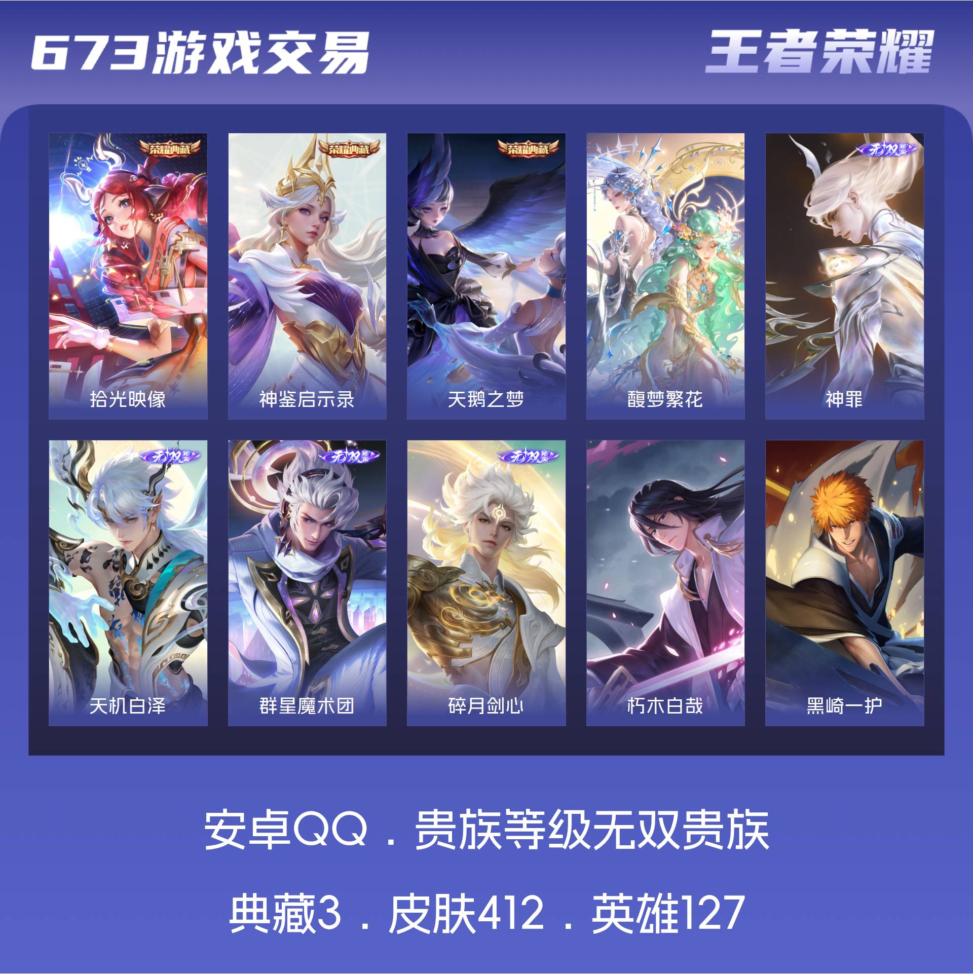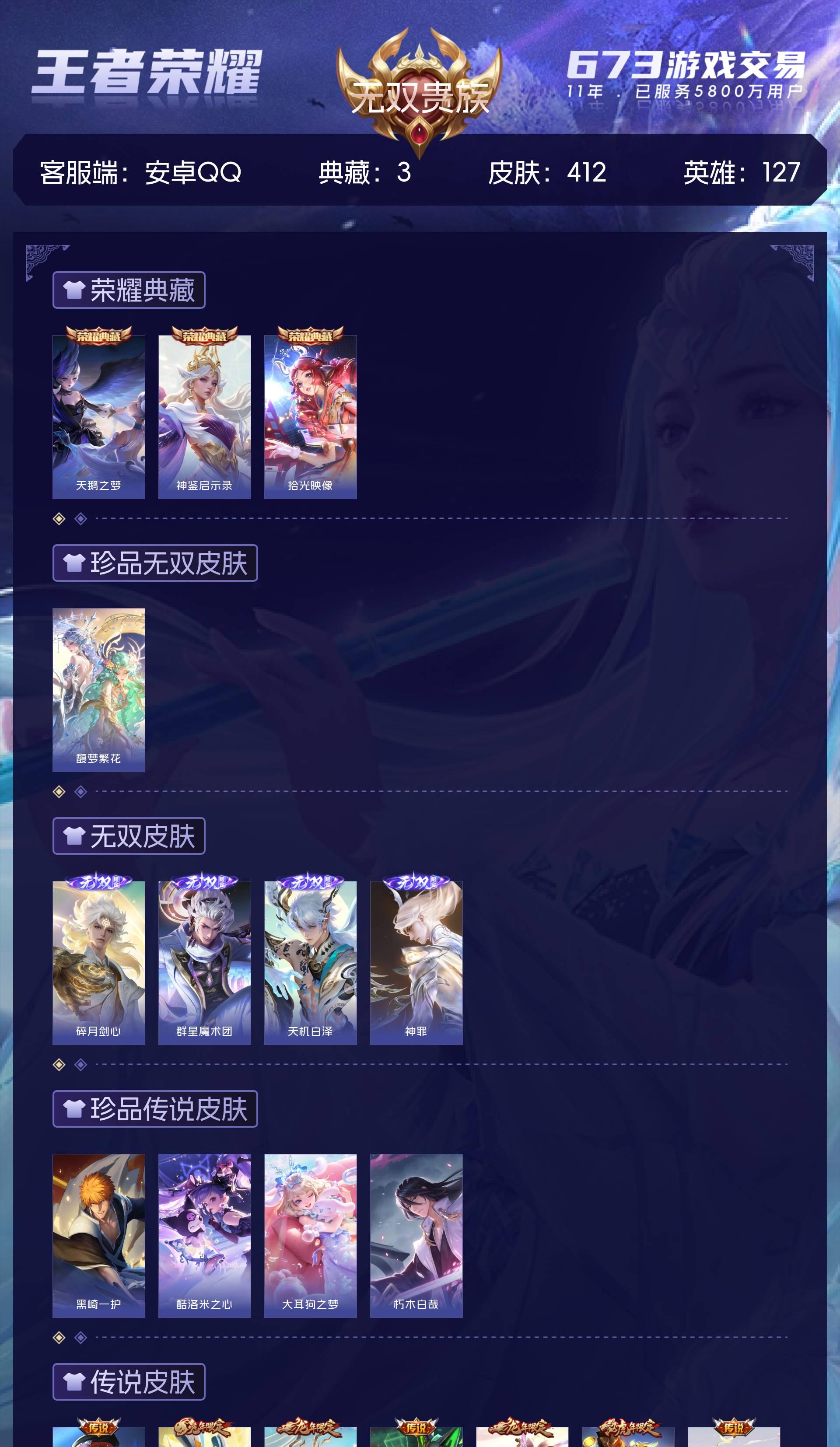 安卓QQ/荣耀王者/412皮肤/127英雄/3典藏/1珍品无双/4无双/4珍品传说/55传说/133史诗/9稀有英雄