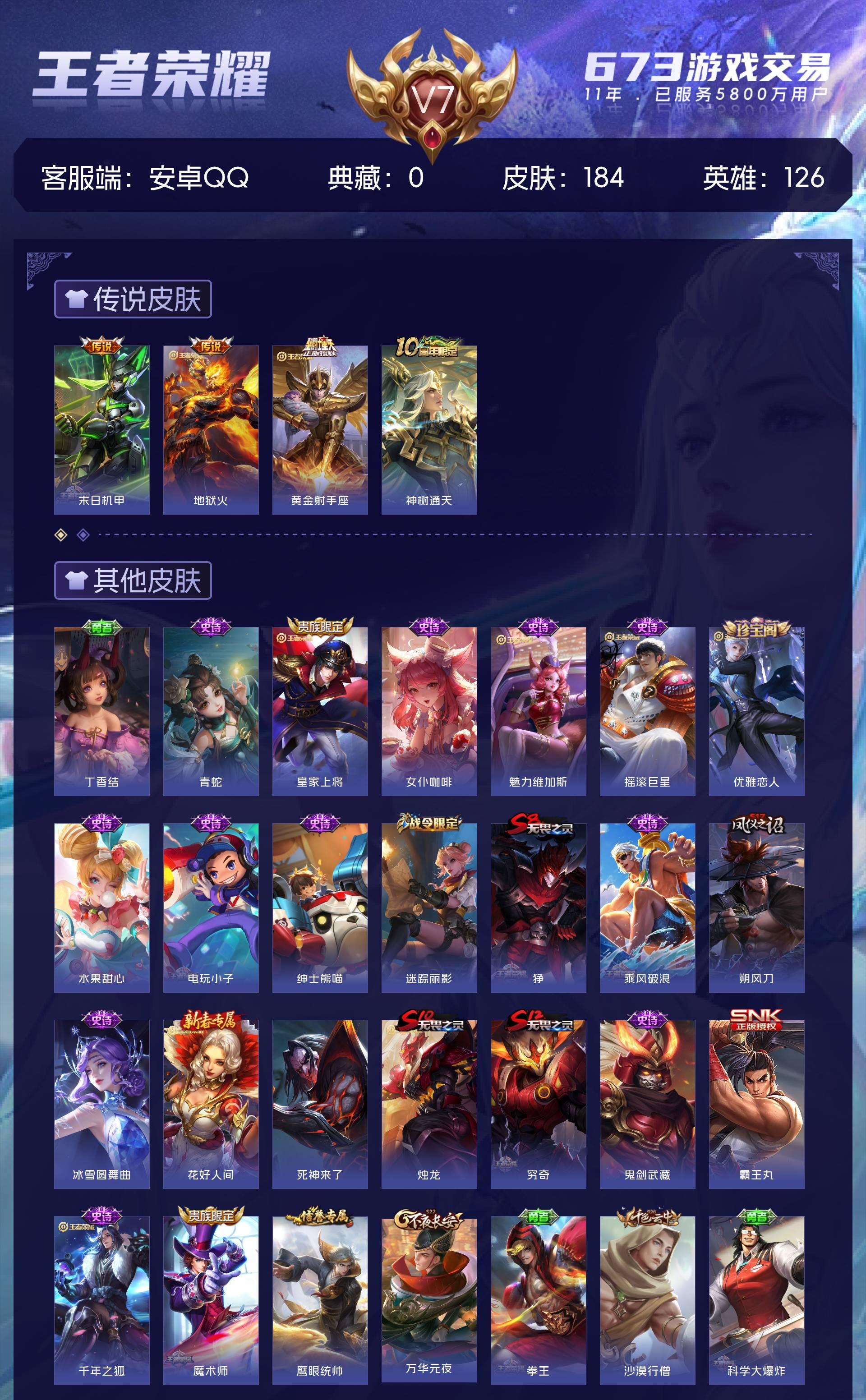 616-【184皮肤4传说可秒换绑】安卓Q-126英雄【4传说】神树通天 黄金射手座 末日机甲 地狱火【38史诗】万灵启世 冰锋战神 龙之律动 大圣娶亲 百相守梦 光弋星穹 拒霜思 功夫厨神 女仆咖啡 魅力维加斯 魔术师 鹰眼统帅 圣诞恋歌 鬼剑武藏 白龙吟 逐梦之影 青春决赛季 曙光守护者 暗隐猎兽者 千年之狐 逐浪之夏 绅士熊喵 电玩小子 狂想玩偶喵 李小龙 水果甜心 乘风破浪 青蛇 冰冠公主 摇滚巨星 优雅恋人 纤云弄巧 乱世虎臣 皇家上将 冰雪圆舞曲 黄金分割率 迷踪丽影 特工魅影【10