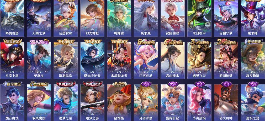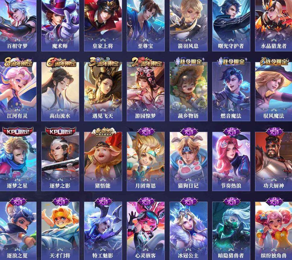 【限定皮肤】:白起狰,大乔绒语心约,狄仁杰阴阳师,虞姬凯尔特女王,赵云皇家上将,庄周蜃楼王,庄周高山流水,孙膑妖精王,扁鹊炼金王,芈月重明,吕布猎兽之王,