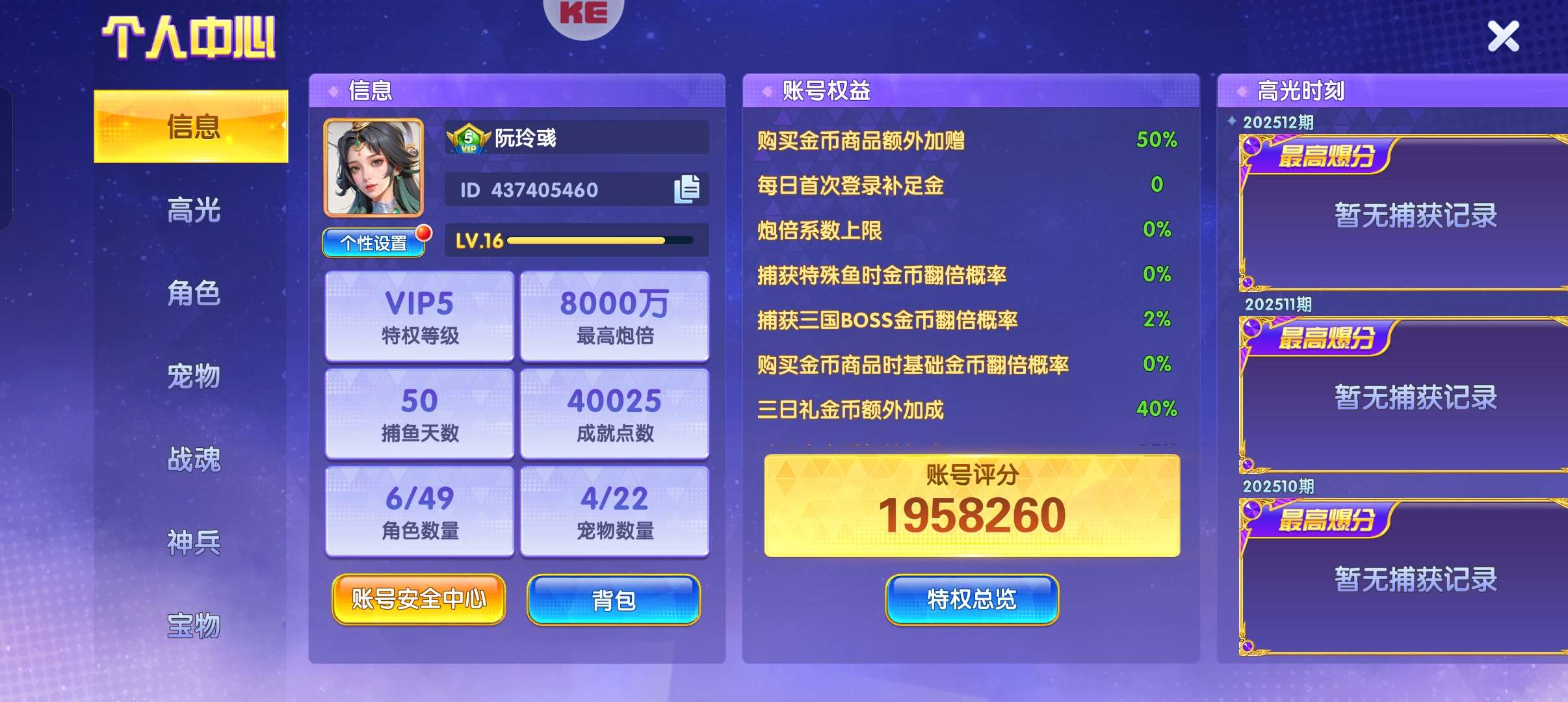 捕鱼大世界通行证破产号卖断 62天新号 贵6 万炮 三个三国角色 宠物貔貅满级 可以换绑