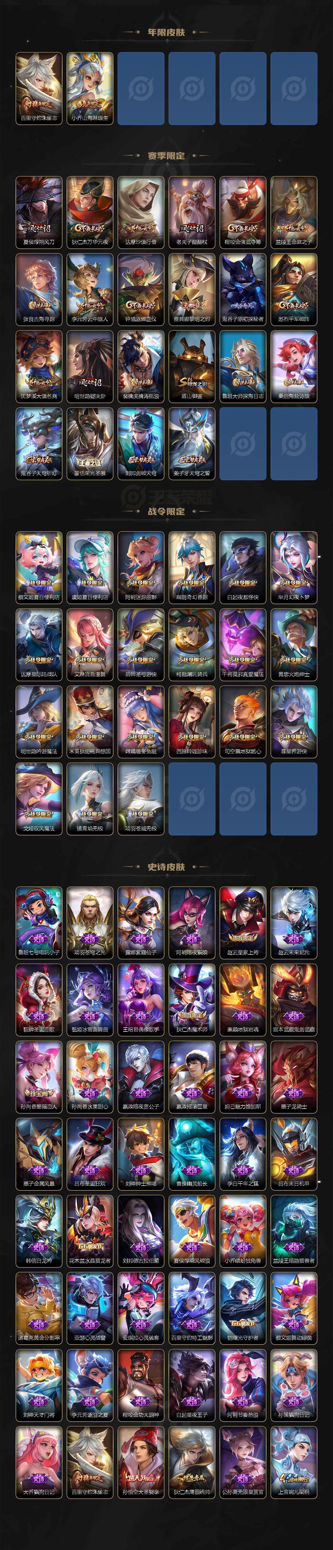 【传说皮肤】:后羿神树通天,云缨幻光神枪,桑启鸣野蒿,小乔山海琳琅生,吕布怒海麟威,孙尚香异界灵契,貂蝉遇见胡旋,曜李逍遥 ,李信一念神魔,虞姬云霓雀翎,梦奇胖达荣荣,诸葛亮武陵仙君,貂蝉仲夏夜之梦,武则天海洋之心