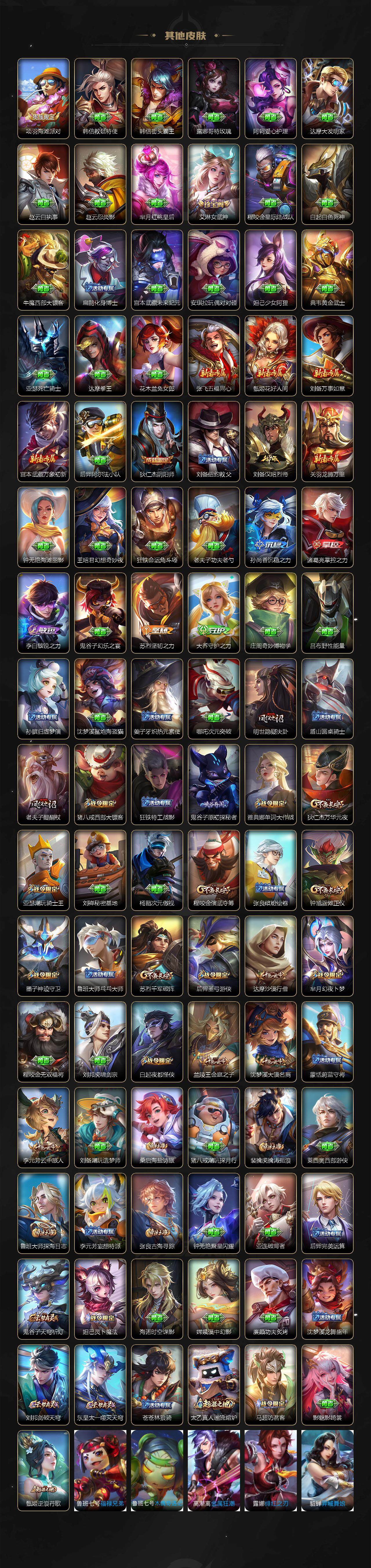 【传说皮肤】:云缨幻光神枪,桑启鸣野蒿,公孙离记忆之芯,马超无双飞将,裴擒虎寅虎赤拳,铠绛天战甲,镜炽阳神光,虞姬启明星使,曜云鹰飞将,李信一念神魔,刘备时之恋人,孙尚香末日机甲,宫本武藏地狱之眼,狄仁杰超时空战士