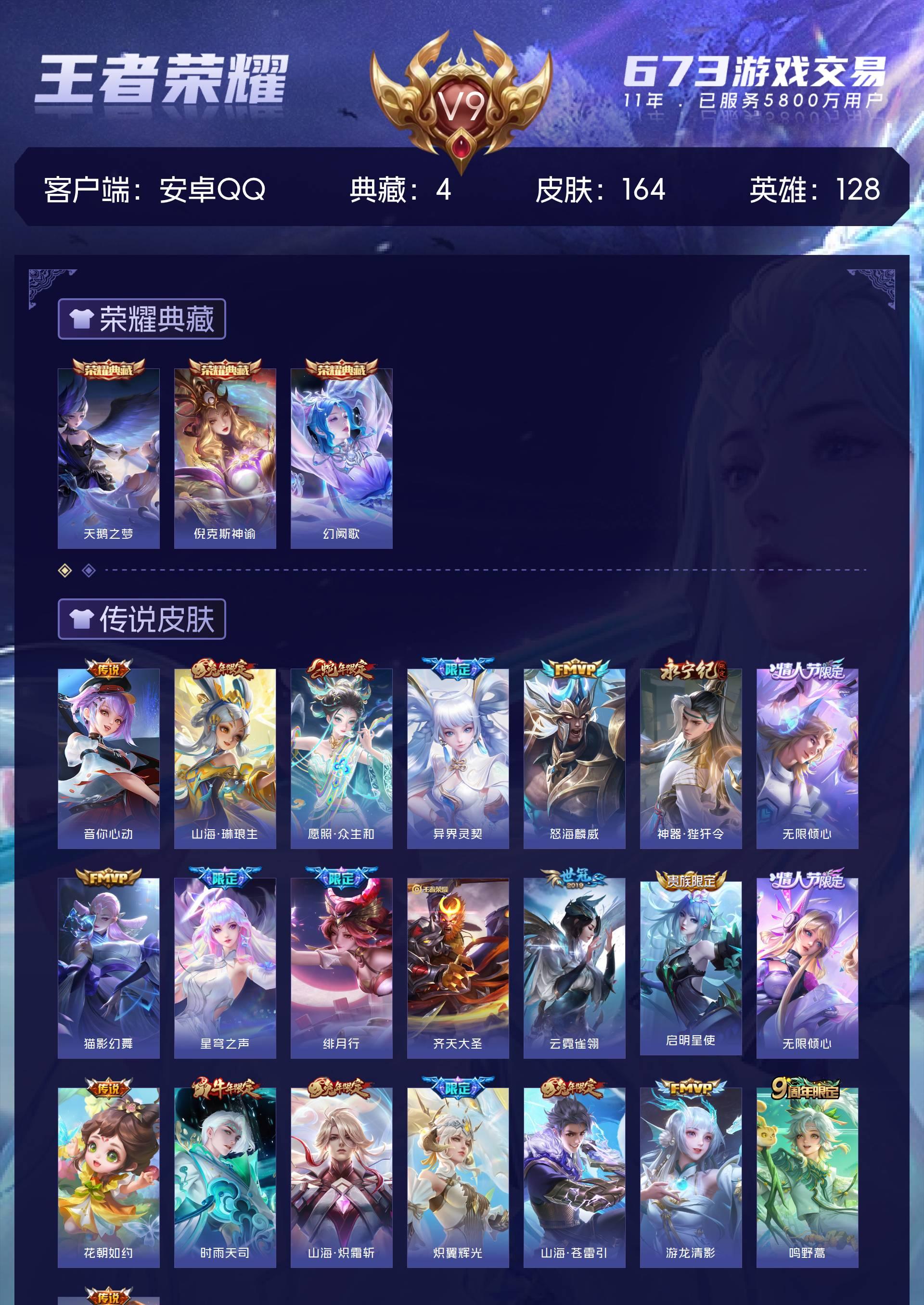V9 皮肤164 英雄128 永恒钻石 荣耀典藏4 传说22 其他皮肤67