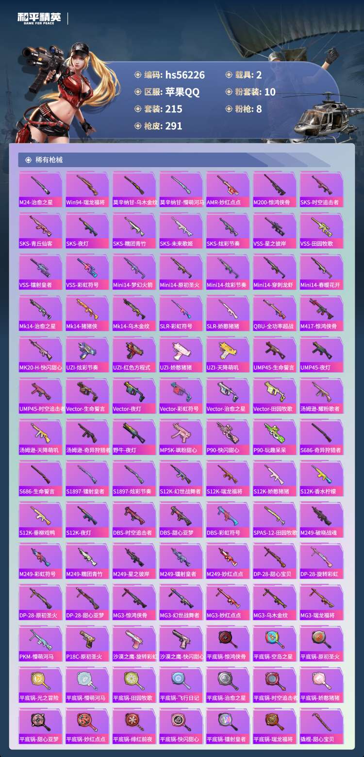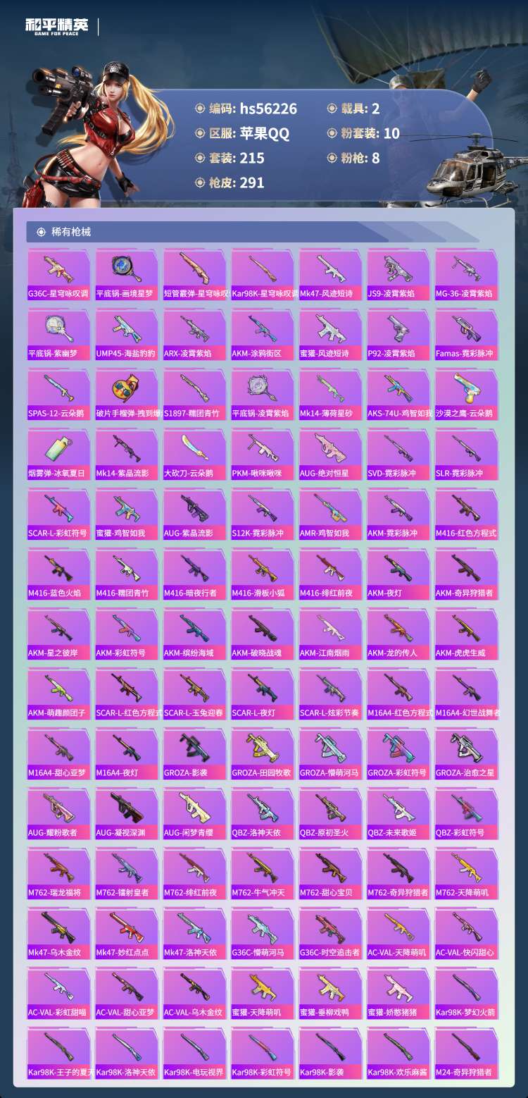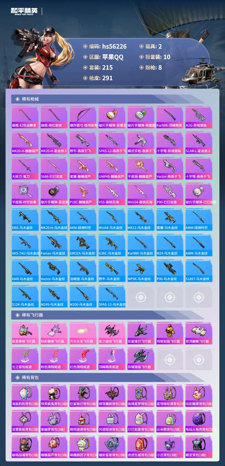hs56226 安卓手Q-16王牌印记-10粉装-8特效枪-2载具-88954热力值-215套装-2