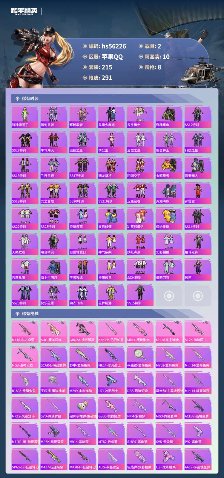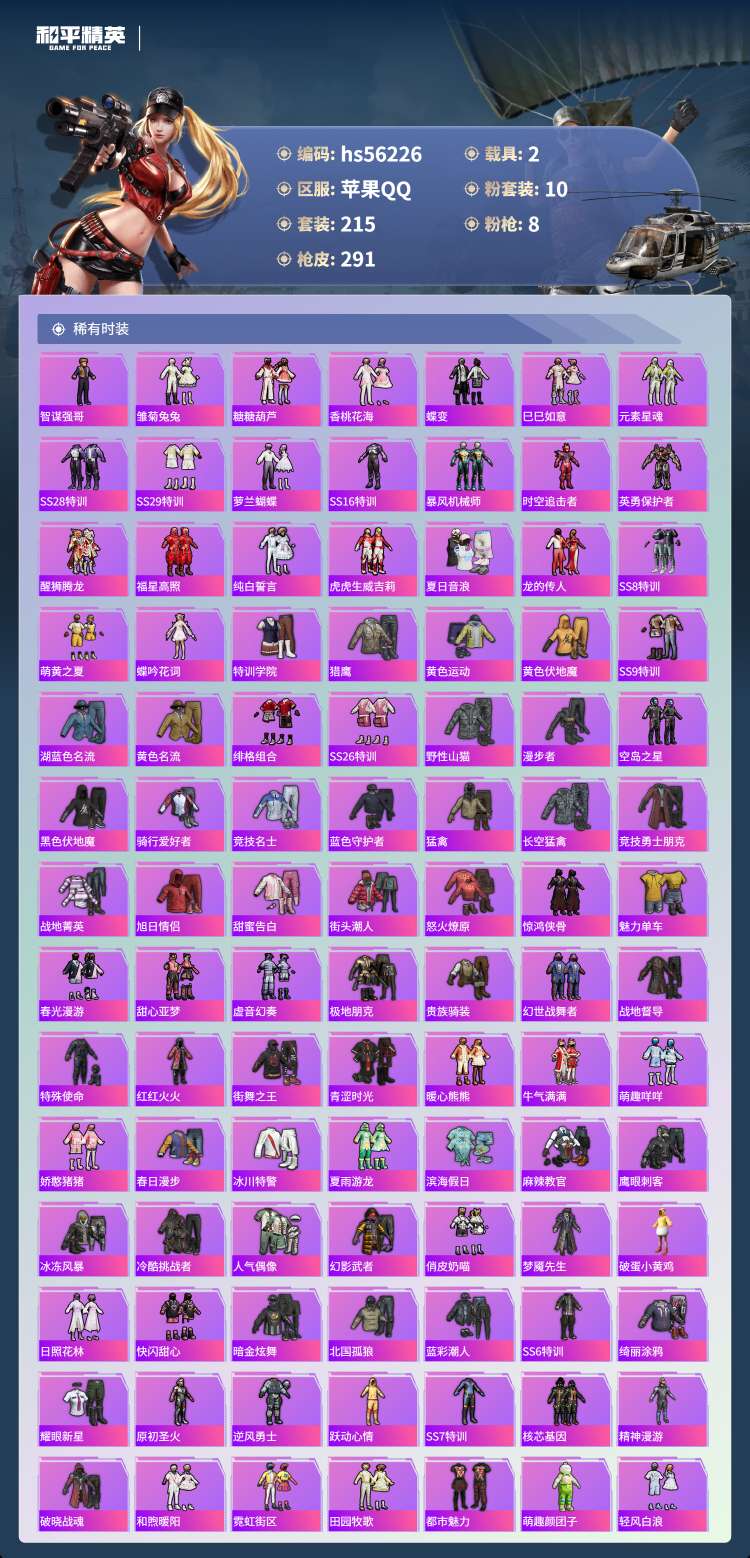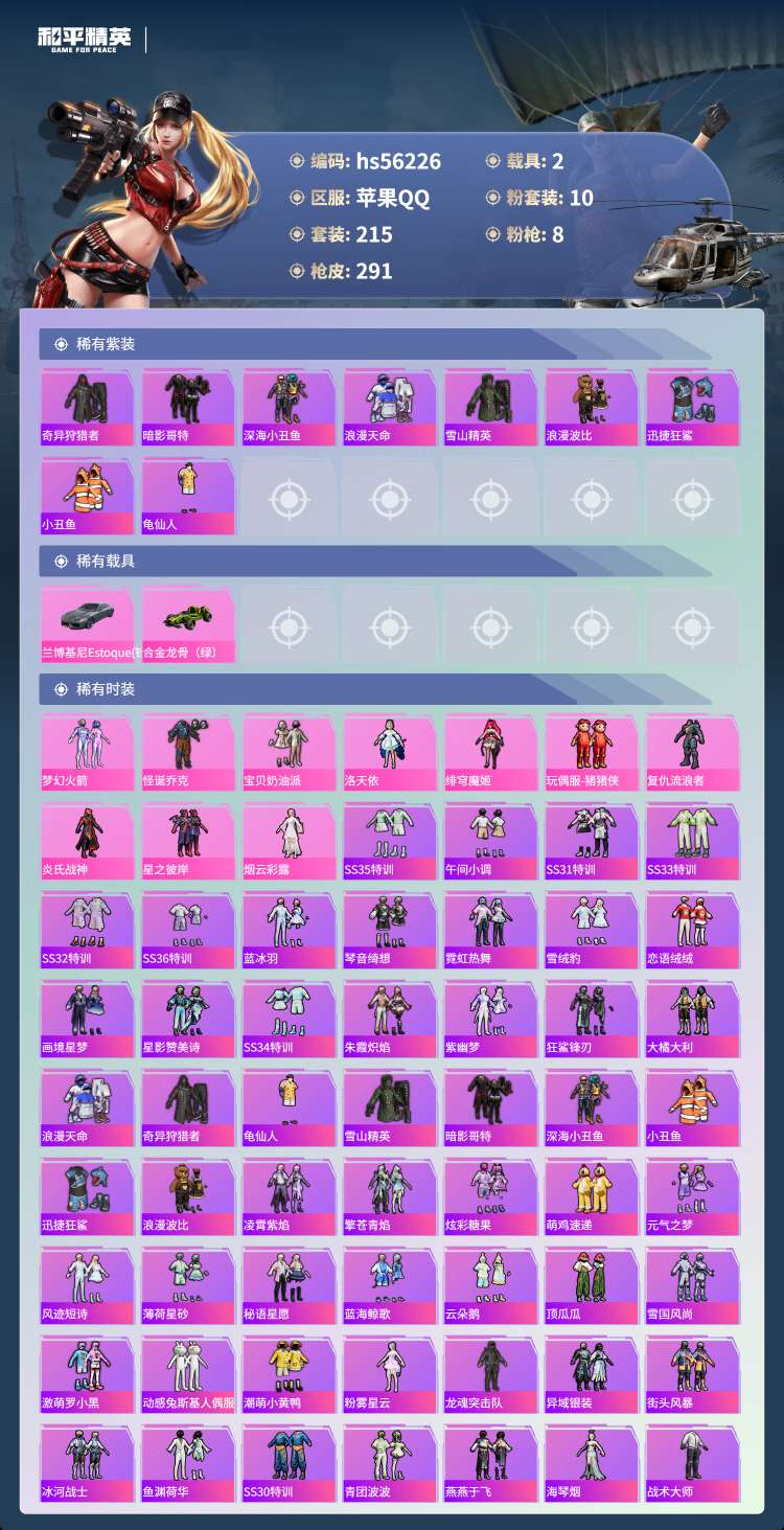 hs56226 安卓手Q-16王牌印记-10粉装-8特效枪-2载具-88954热力值-215套装-2