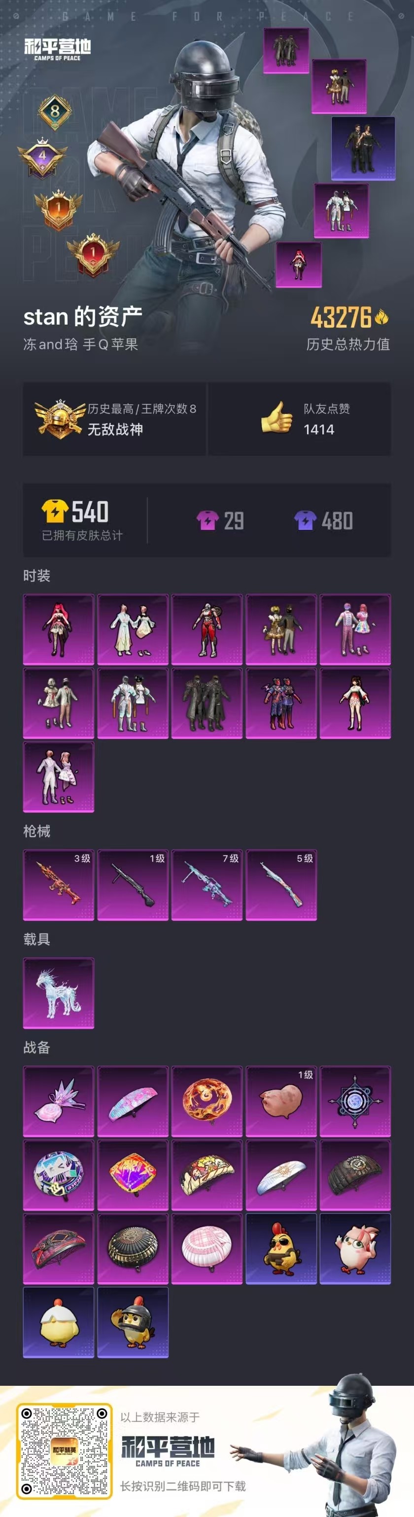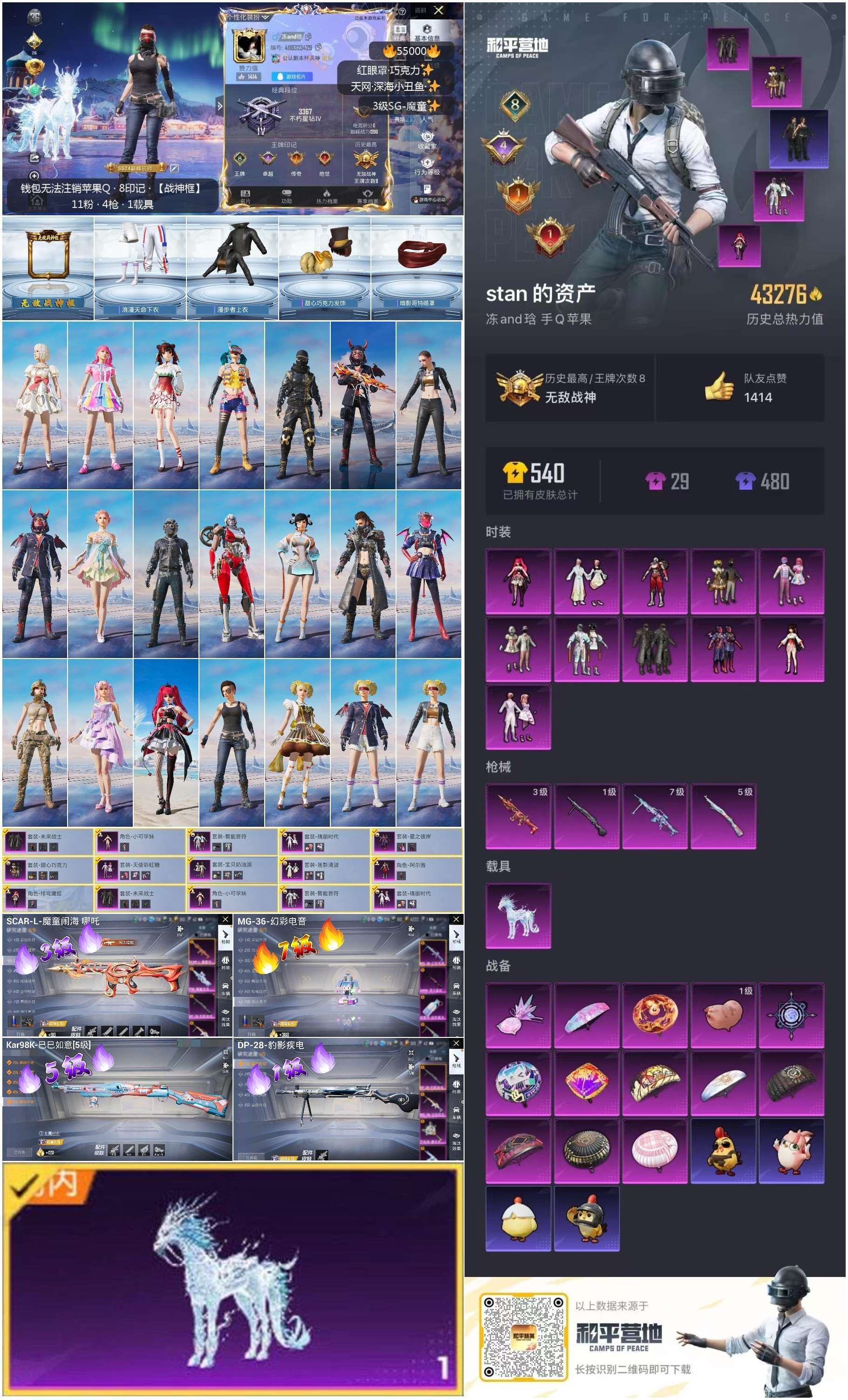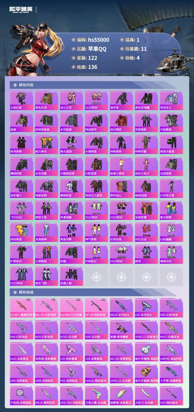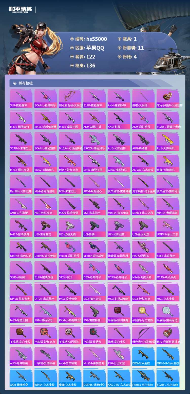 hs55000 苹果手Q-8王牌印记-有战神框-11粉装-4特效枪-1载具-43301热力值-122