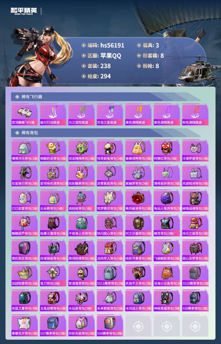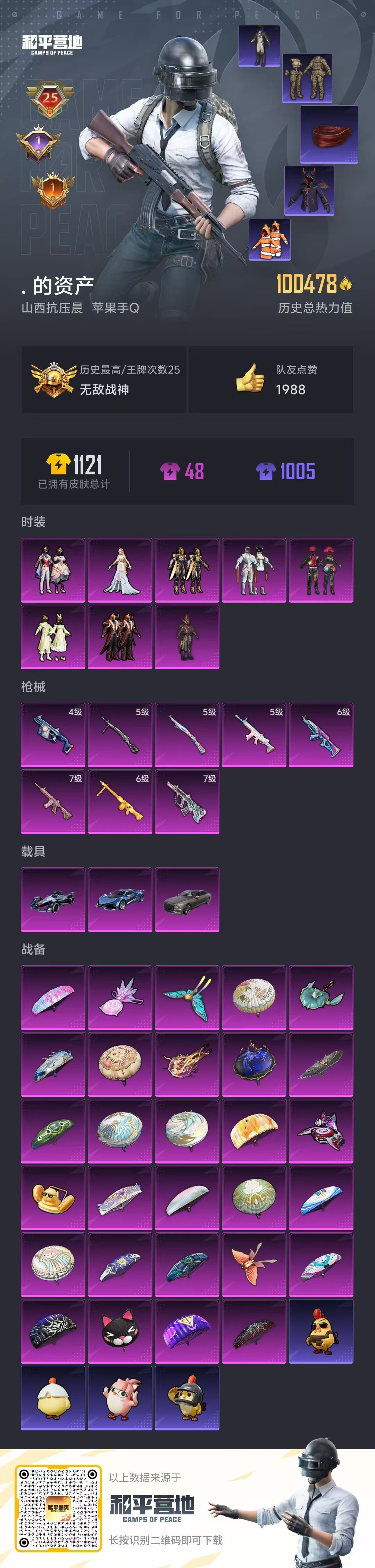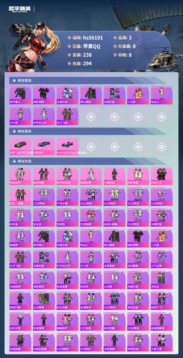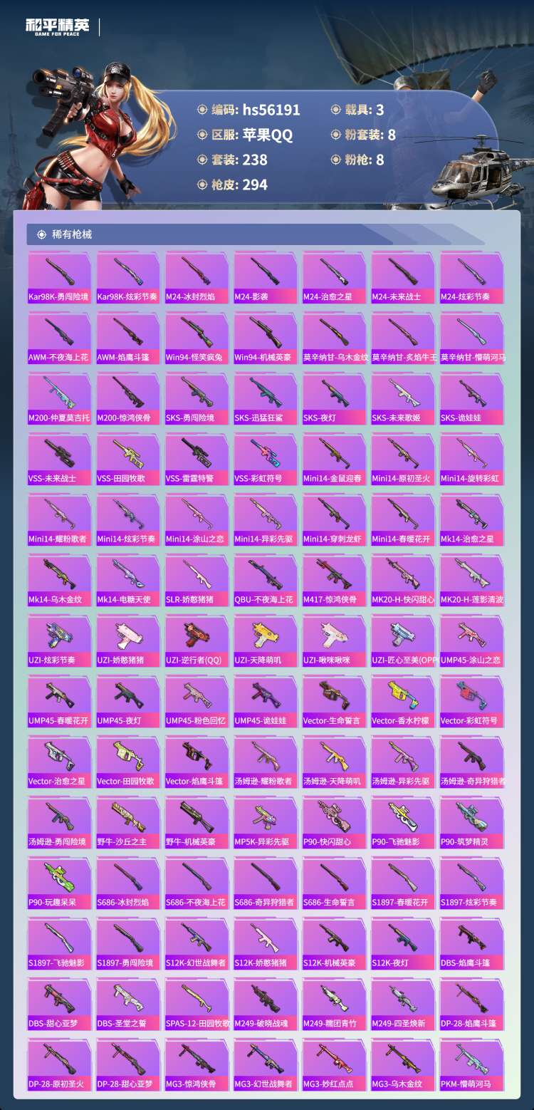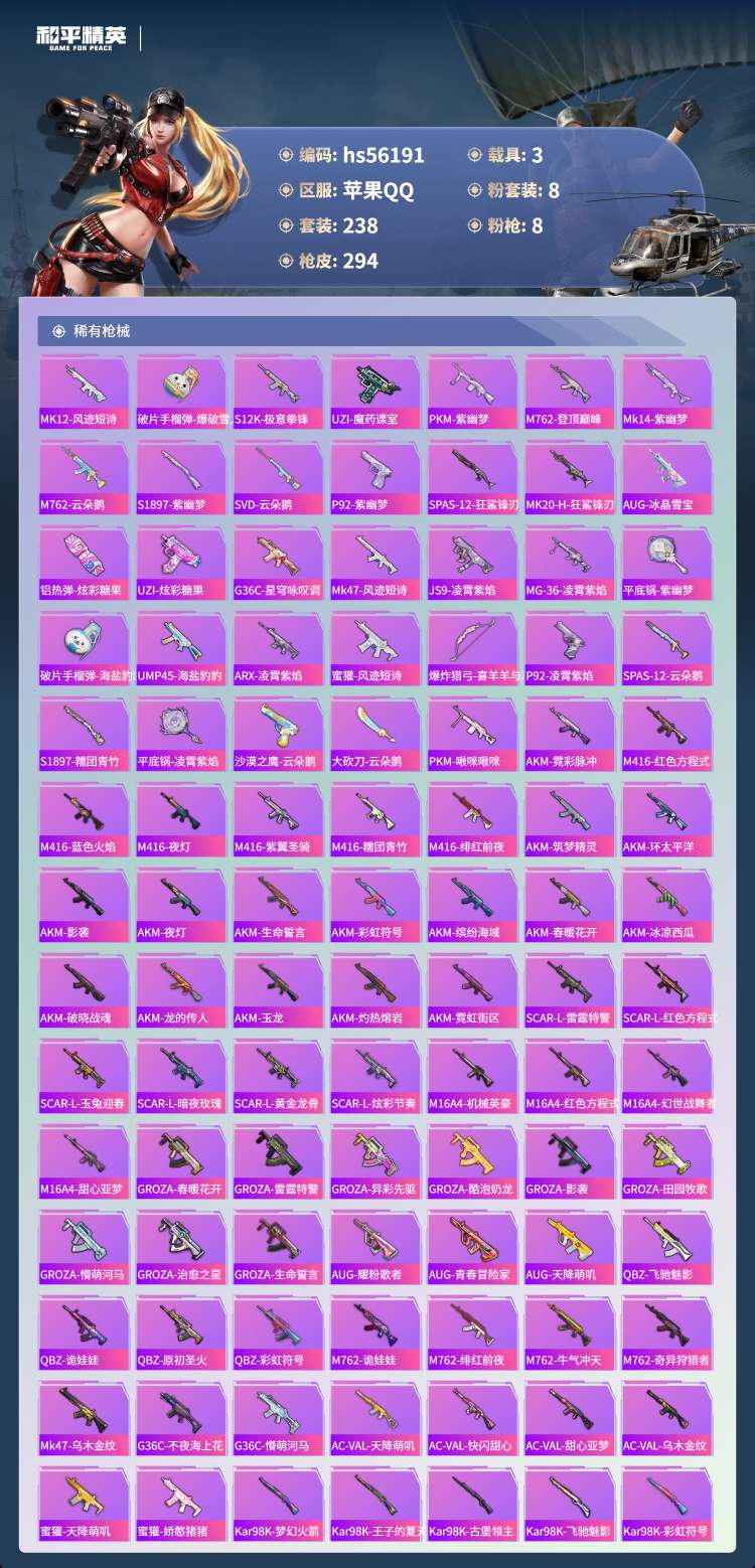 hs56191 苹果手Q-25王牌印记-有战神框-8粉装-8特效枪-3载具-100478热力值-23