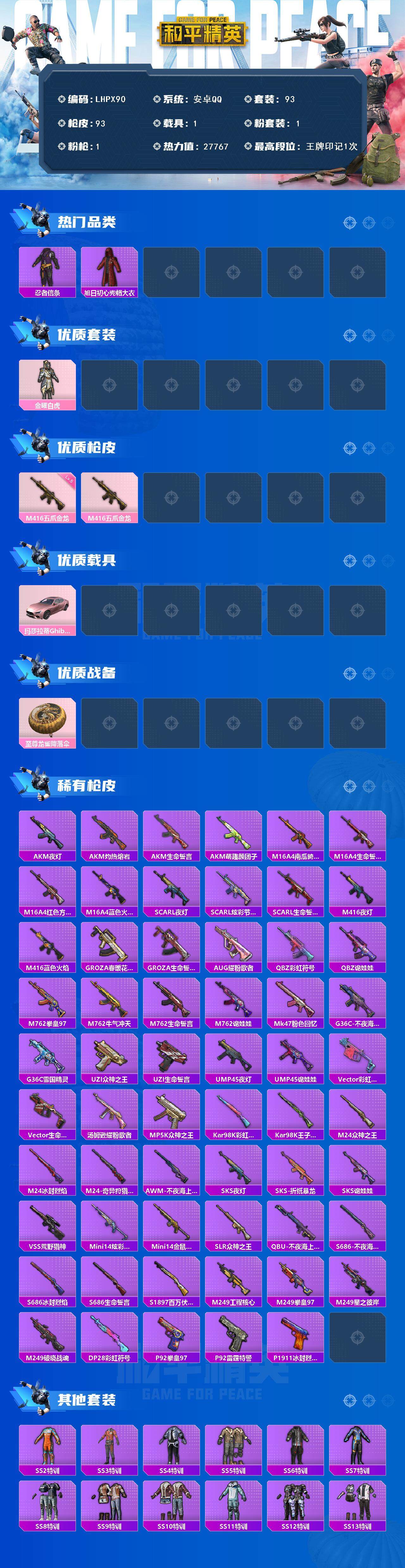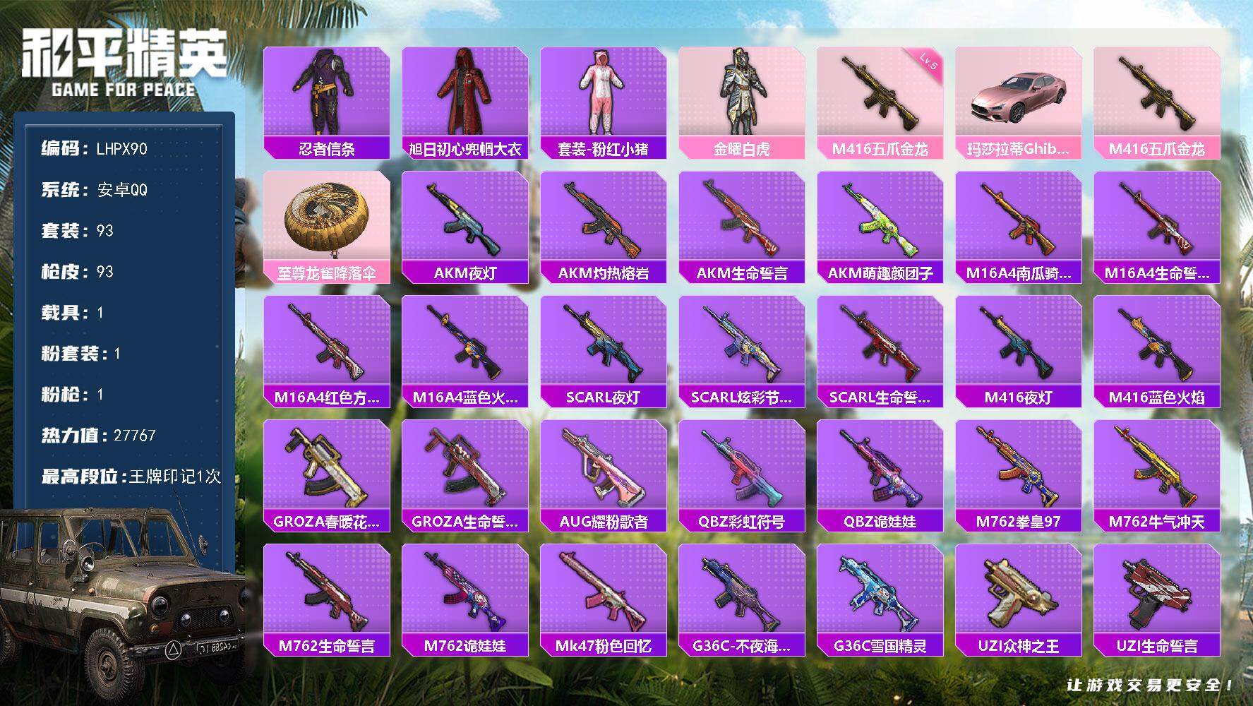 【特价出售/店主推荐】 连体王者v7安卓 手Q-1粉装-1特效枪-1载具-0粉色飞行器-27767热力值-1王牌印记-93套装-93枪皮