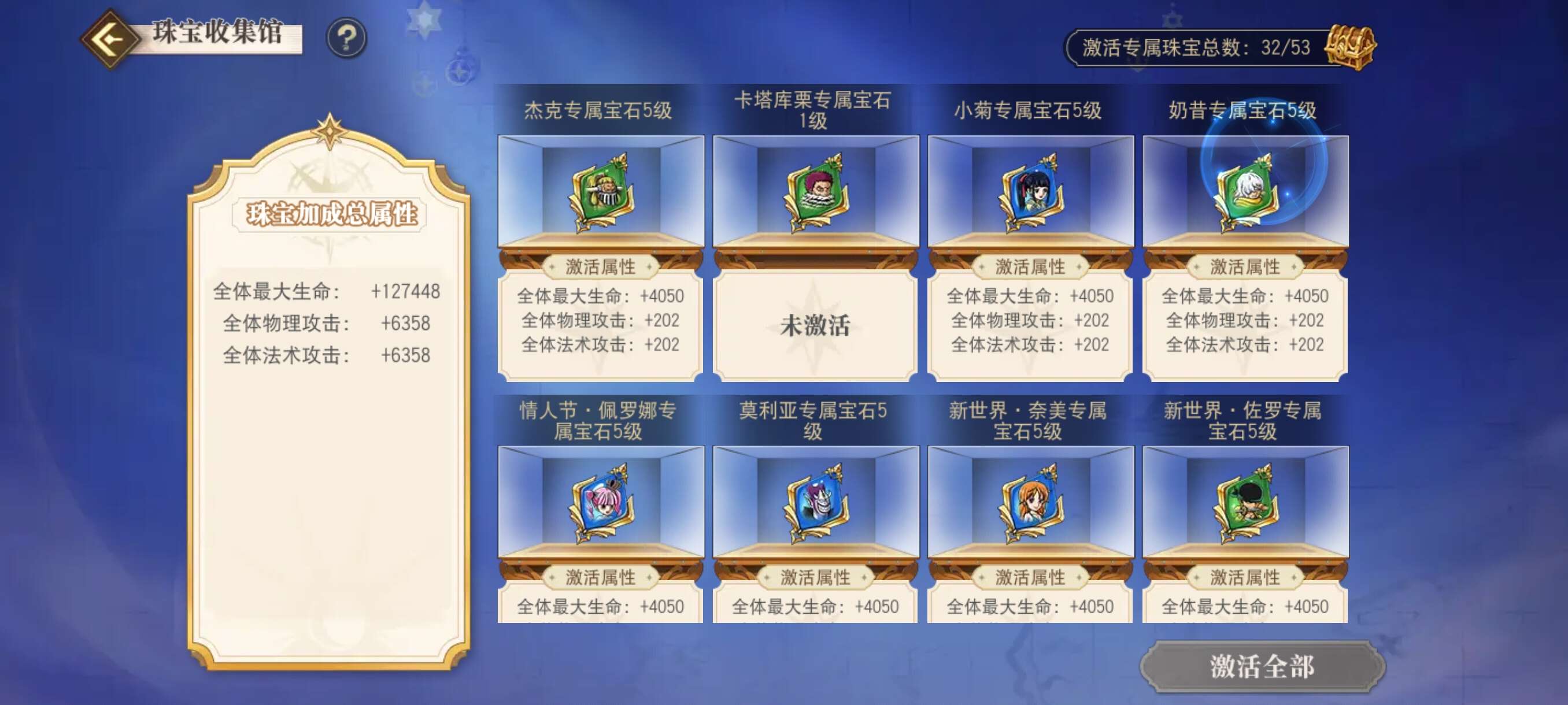 五觉和妈,一觉青白(已有10片),三觉罗杰黑胡子,二觉库赞,皮肤全图鉴毕业,具体内容看图片,全可换绑