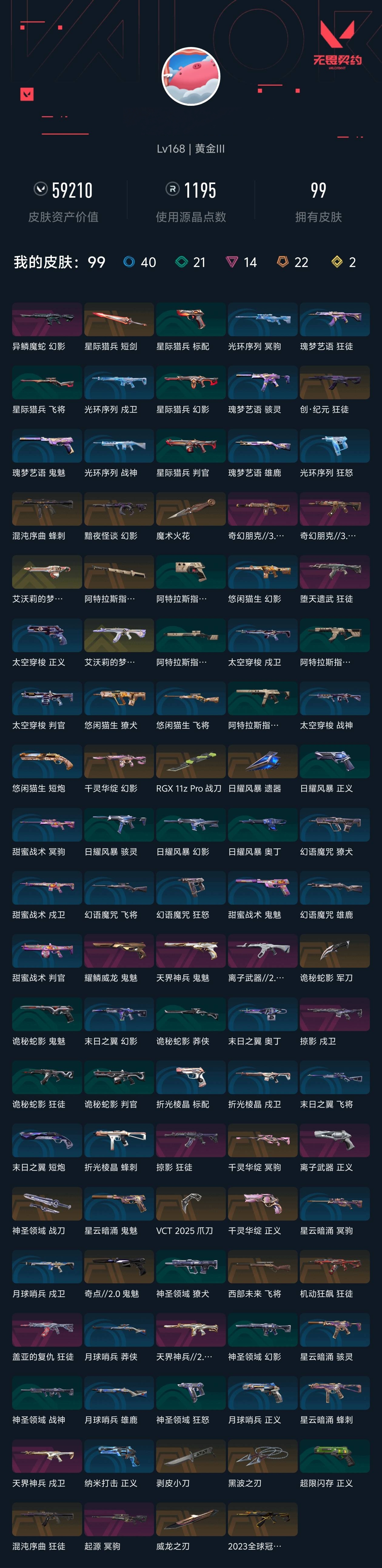 MWW480【资产59210 VCT25爪刀 黑波之刃 剥皮小刀 威龙之刃 23狂徒】【游戏等级】Lv168 【段位】 黄金III 【R点】1,195 【皮肤总价值】59,210 【英雄数量】28 【皮肤数量】99 【挂饰数量】102 【卡面数量】129 【喷漆数量】120 【幻影】幻影-异鳞魔蛇 幻影-星际猎兵 幻影-黯夜怪谈 幻影-奇幻朋克//3.0 幻影-悠闲猫生 幻影-千灵华绽 幻影-日耀风暴 幻影-末日之翼 幻影-天界神兵//2.0 幻影-神圣领域 【近战武器】近战武器-星际猎兵短剑