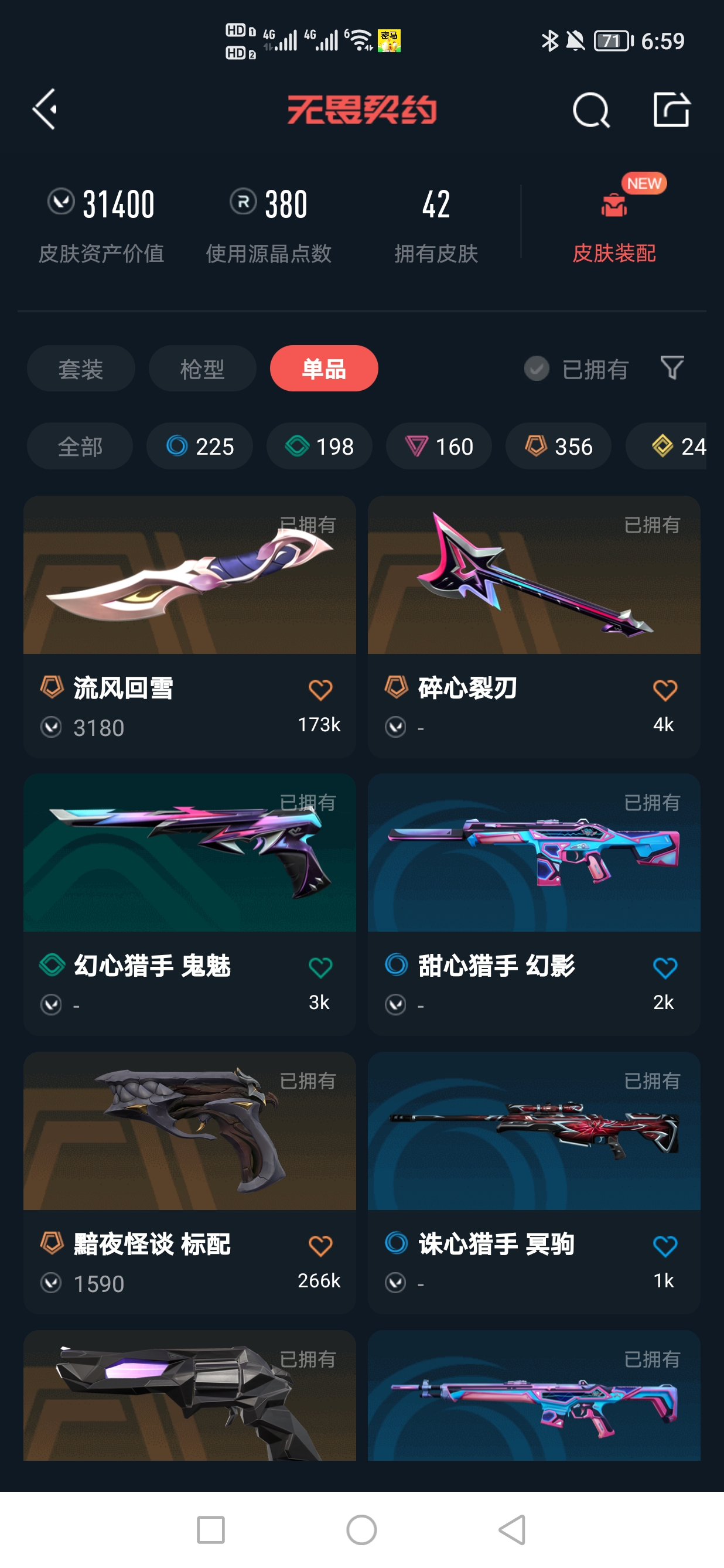 MWW492【游戏等级】Lv45 【段位】 白银I 【R点】380 【皮肤总价值】31,400 【英雄数量】10 【皮肤数量】42 【挂饰数量】26 【卡面数量】41 【喷漆数量】38 【近战武器】近战武器-流风回雪 近战武器-碎心裂刃 近战武器-星际猎兵短剑 近战武器-鬼丸国纲 近战武器-堕天遗武仪式匕首 【鬼魅】鬼魅-幻心猎手 鬼魅-瑰梦艺语 鬼魅-盖亚的复仇 【幻影】幻影-甜心猎手 幻影-千灵华绽 幻影-星际猎兵 幻影-混沌序曲//2.0 【标配】标配-黯夜怪谈 标配-星际猎兵 【冥驹】