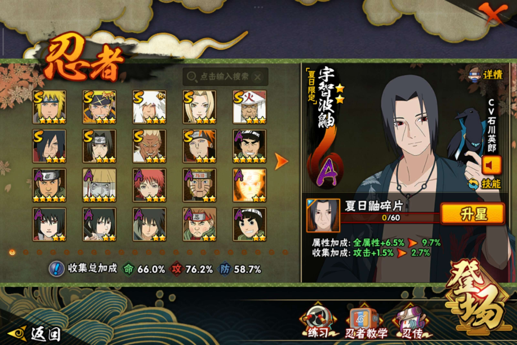 【S级忍者】宇智波斑「秽土转生·解」(3星),艾「忍界大战」(3星),自来也「舞之豪杰」(3星),宇智波鼬「须佐能乎」(3星),佩恩「天道」(3星),波风水门(4星),纲手(3星),猿飞日斩(3星),