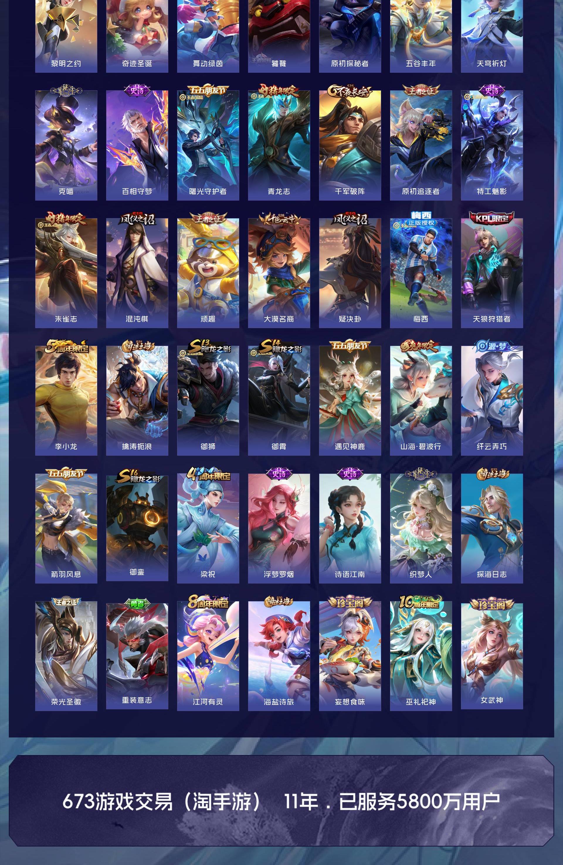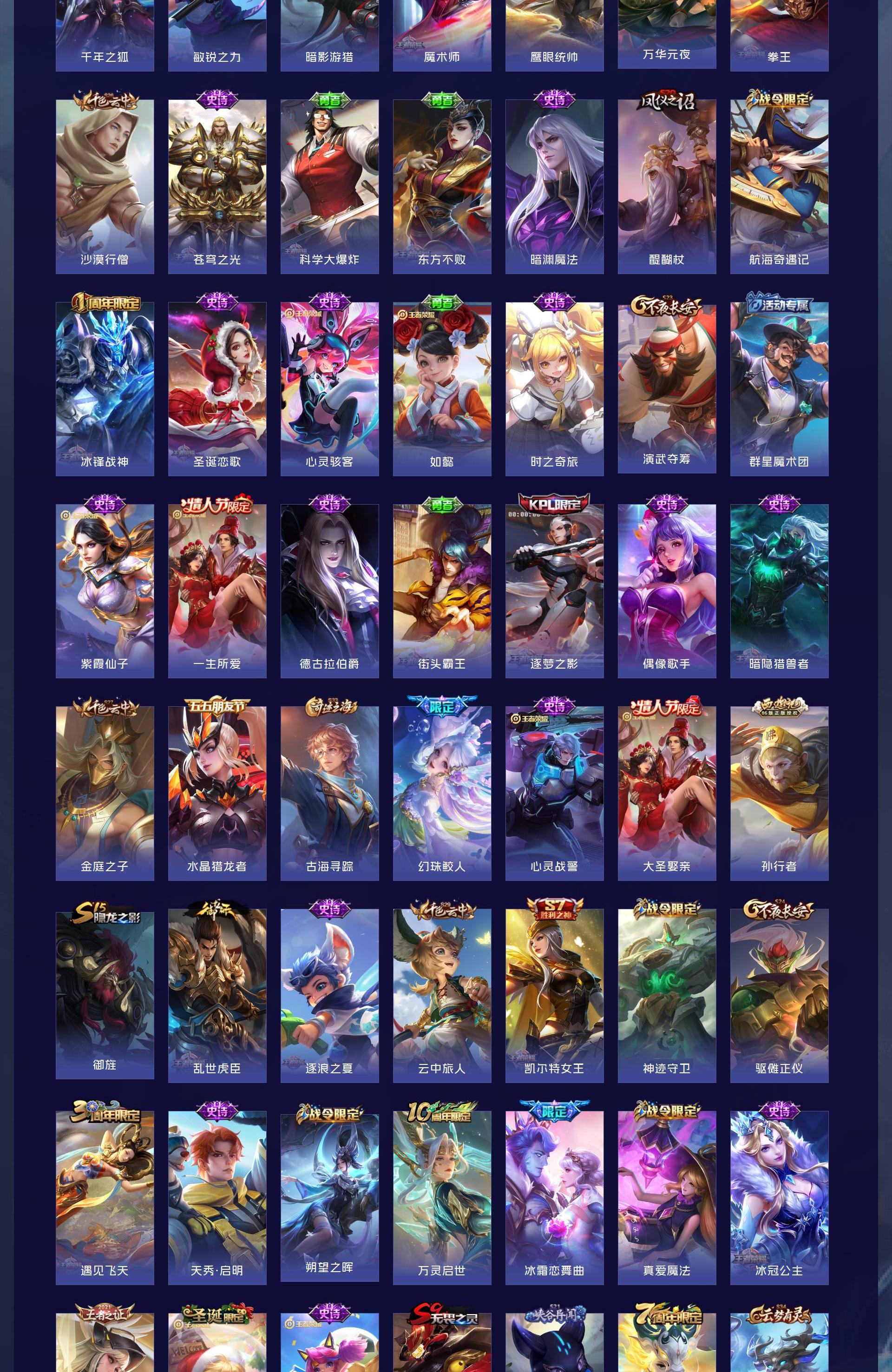 【限定皮肤】:白起狰,狄仁杰阴阳师,虞姬凯尔特女王,赵云皇家上将,赵云引擎之心,墨子神迹守卫,妲己热情桑巴,嬴政优雅恋人,嬴政白昼王子,鲁班七号狮舞东方