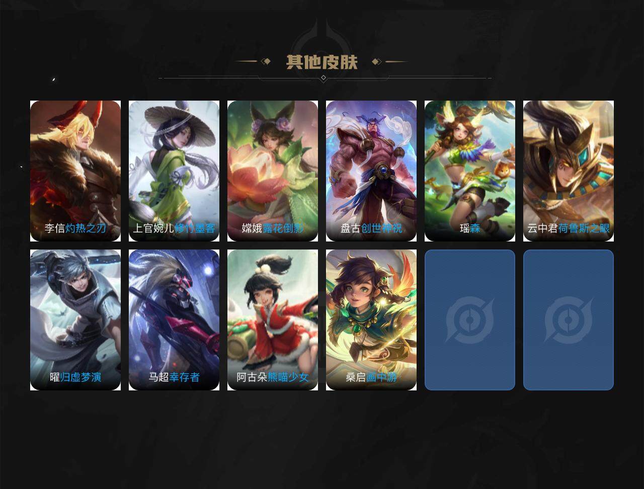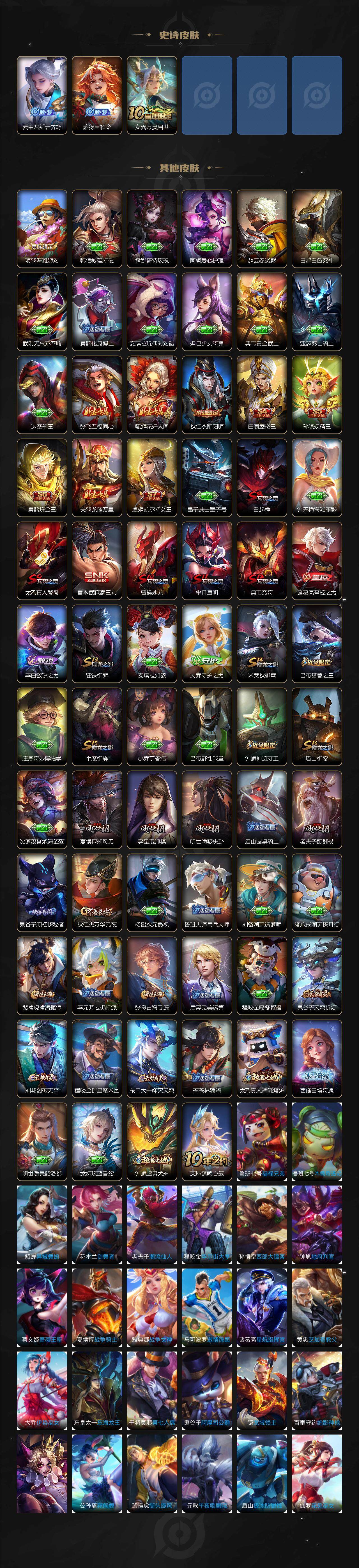【限定皮肤】:白起狰,狄仁杰阴阳师,虞姬凯尔特女王,赵云皇家上将,嬴政白昼王子,鲁班七号狮舞东方,庄周蜃楼王,钟无艳王者之锤,孙膑妖精王,扁鹊炼金王,芈月重明,吕布猎兽之王,夏侯惇朔风刀,曹操烛龙,典韦穷奇,狄仁杰魔术师,狄仁杰万华元夜,项羽海滩派对,老夫子醍醐杖,孙悟空大圣娶亲,牛魔御