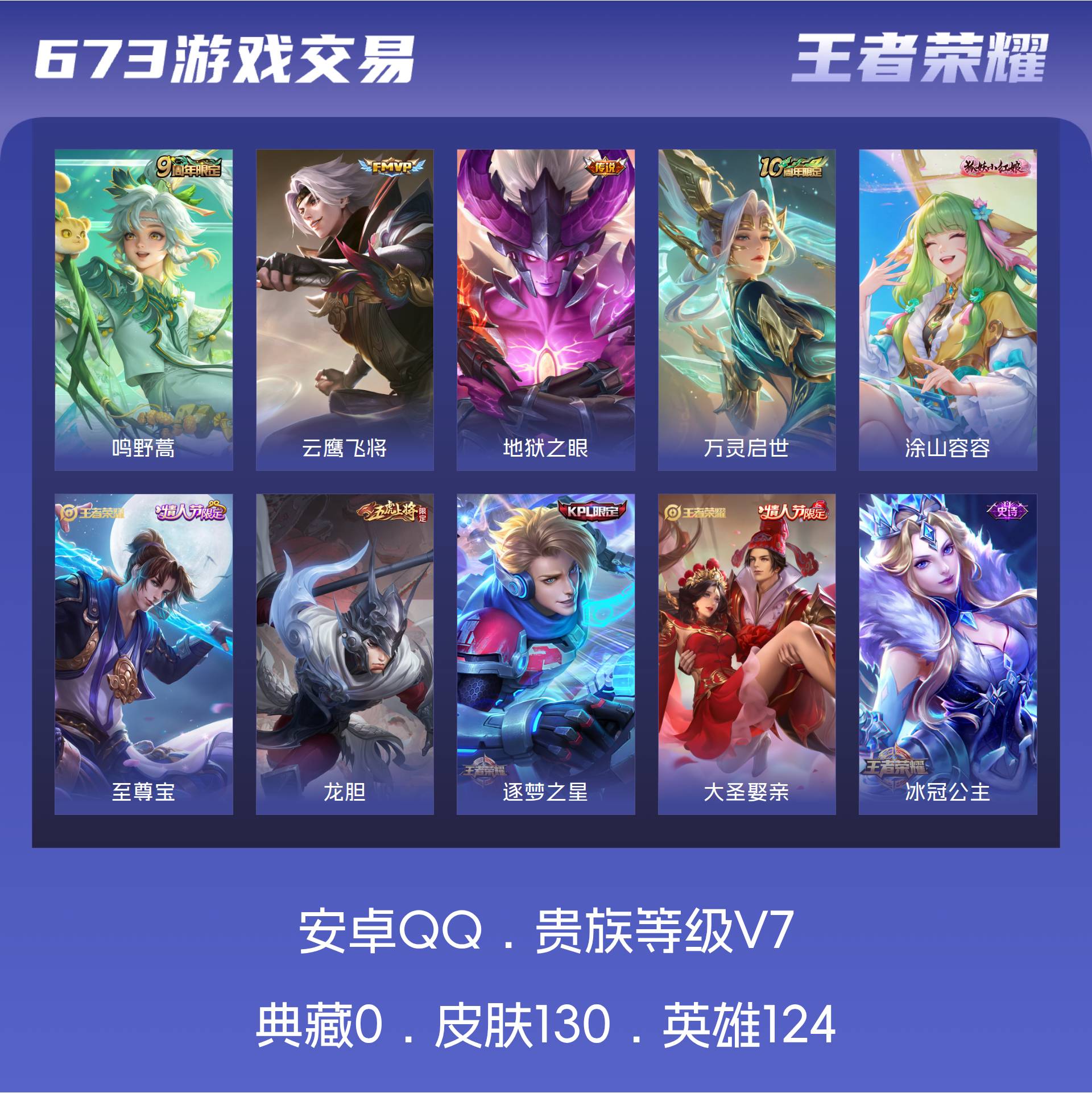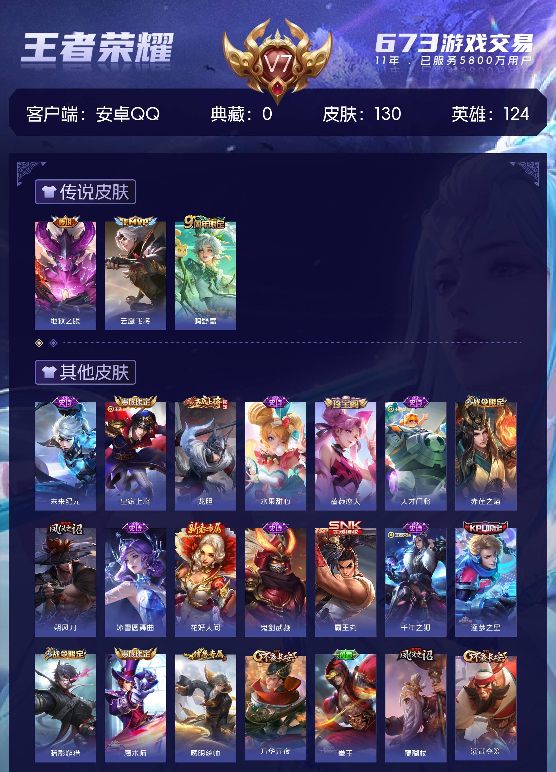 皮肤130 英雄124 非凡王者 传说3 其他皮肤51-至尊宝 龙胆 逐梦之星 大圣娶亲 云鹰飞将 地狱之眼 万灵启世 涂山容容 冰冠公主 暗影游猎 原初