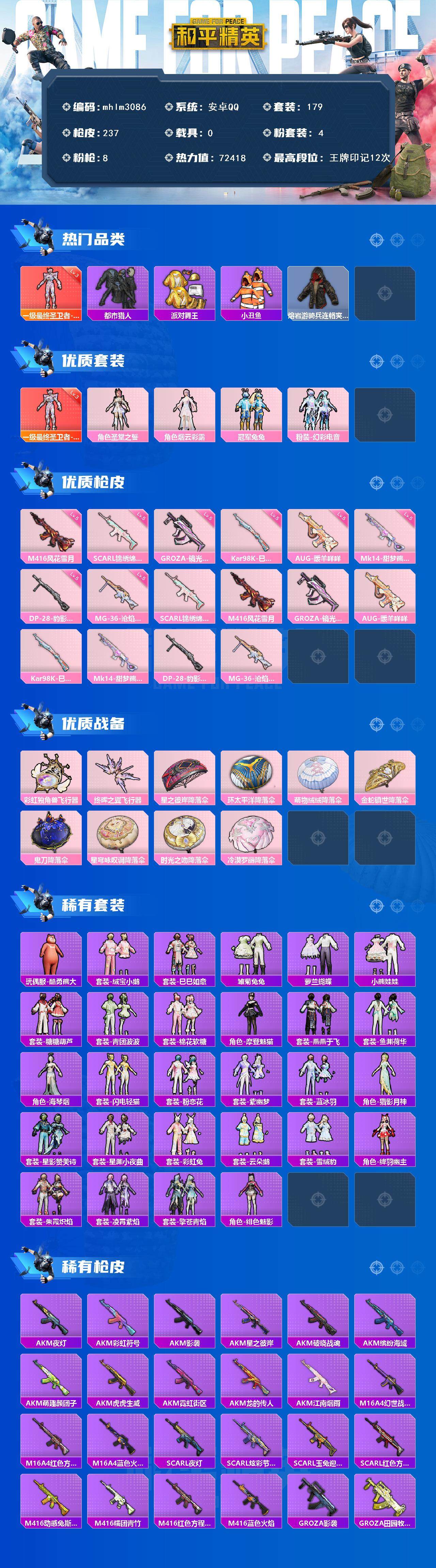 【mhlm3086】安卓 手Q-1神装-4粉装-8特效枪-0载具-2粉色飞行器-72418热力值-12王牌印记-179套装-237枪皮