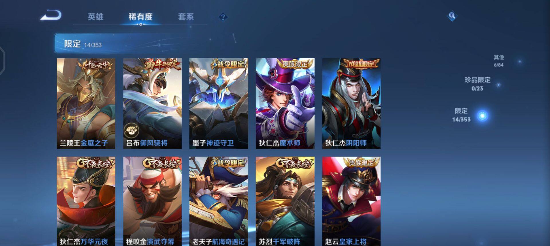 【限定皮肤】:狄仁杰阴阳师,赵云皇家上将,墨子神迹守卫,吕布御风骁将,狄仁杰魔术师,狄仁杰万华元夜,达摩沙漠行僧,项羽海滩派对,老夫子航海奇遇记,程咬金演武夺筹,兰陵王金