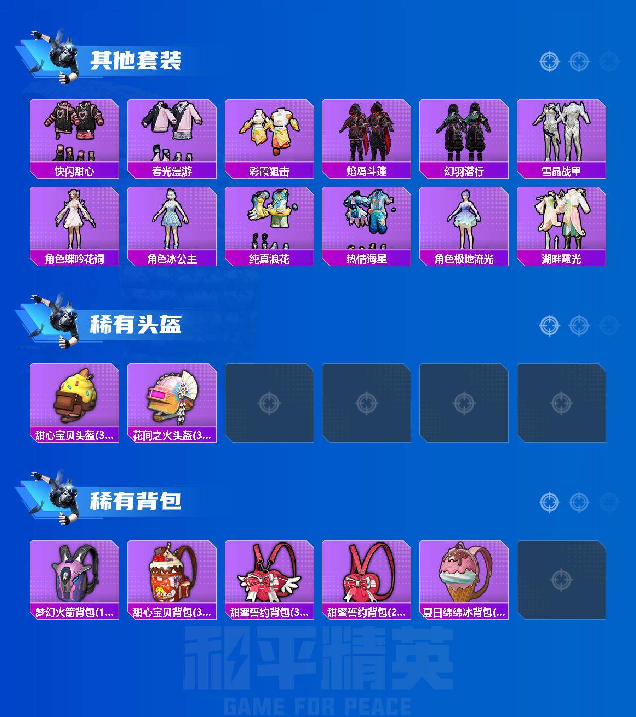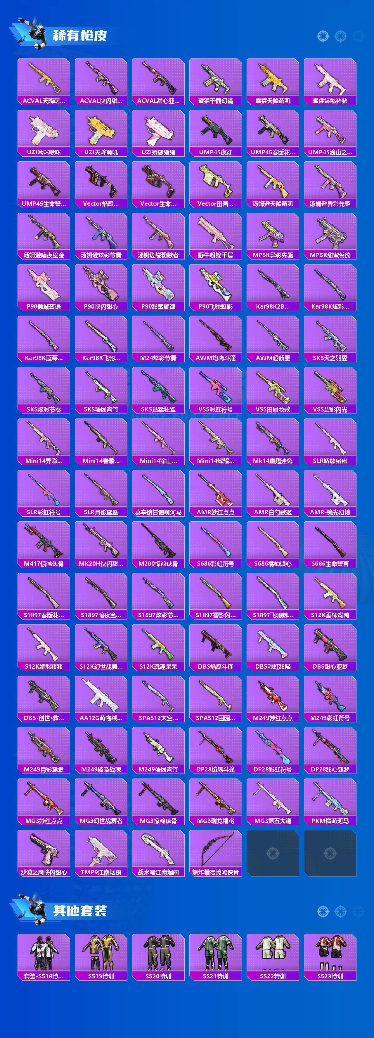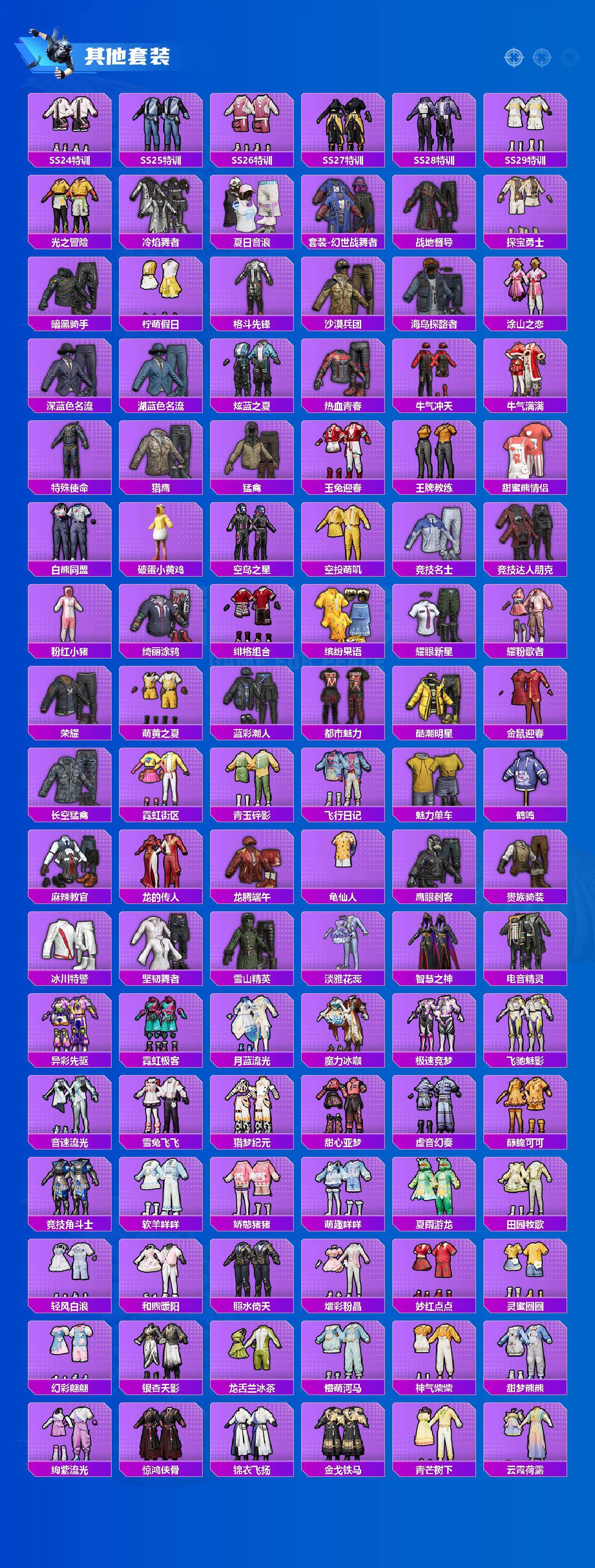 【粉色套装】:粉装-宝贝奶油派,粉装-冰霜白皇,粉装-炙焰红王,粉装-恐龙拽拽,粉装-彩虹甜喵,粉装-冰川红玫,粉装-第五大道,角色-小可学妹,角色-蔷薇星,粉装-镜光幻境,粉装-金丰海韵,角色-荧海星豚