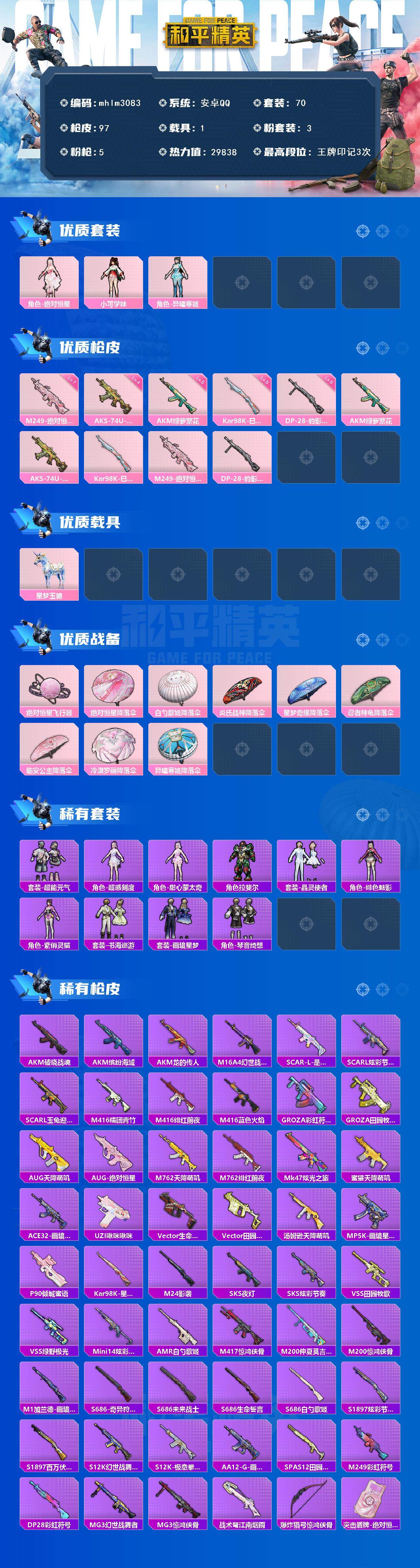 【mhlm3083】安卓 手Q-3粉装-5特效枪-1载具-2粉色飞行器-29838热力值-3王牌印记-70套装-97枪皮