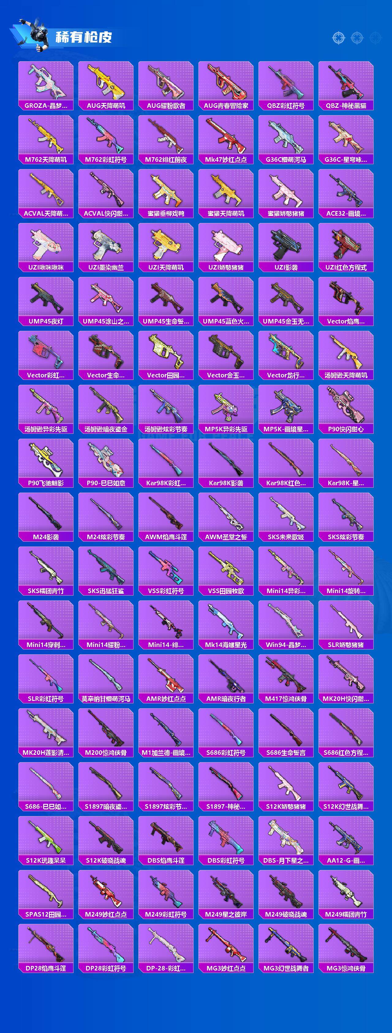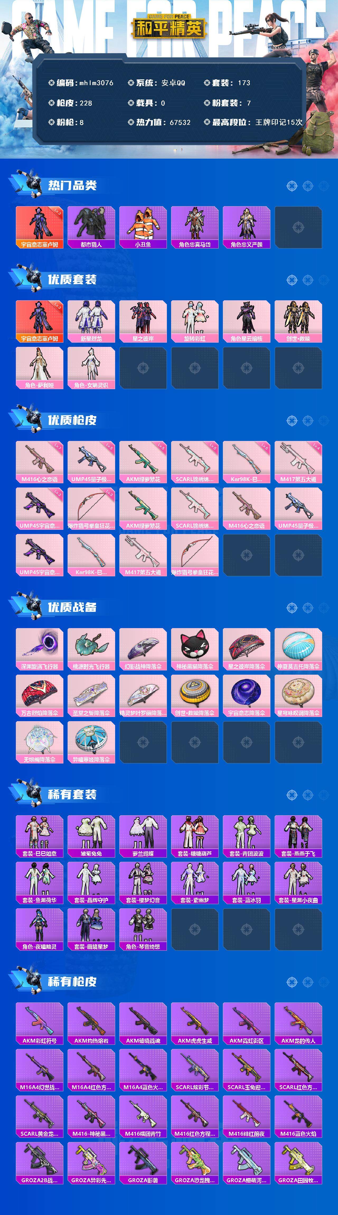 【mhlm3076】安卓 手Q-1神装-7粉装-8特效枪-0载具-2粉色飞行器-67532热力值-15王牌印记-173套装-228枪皮