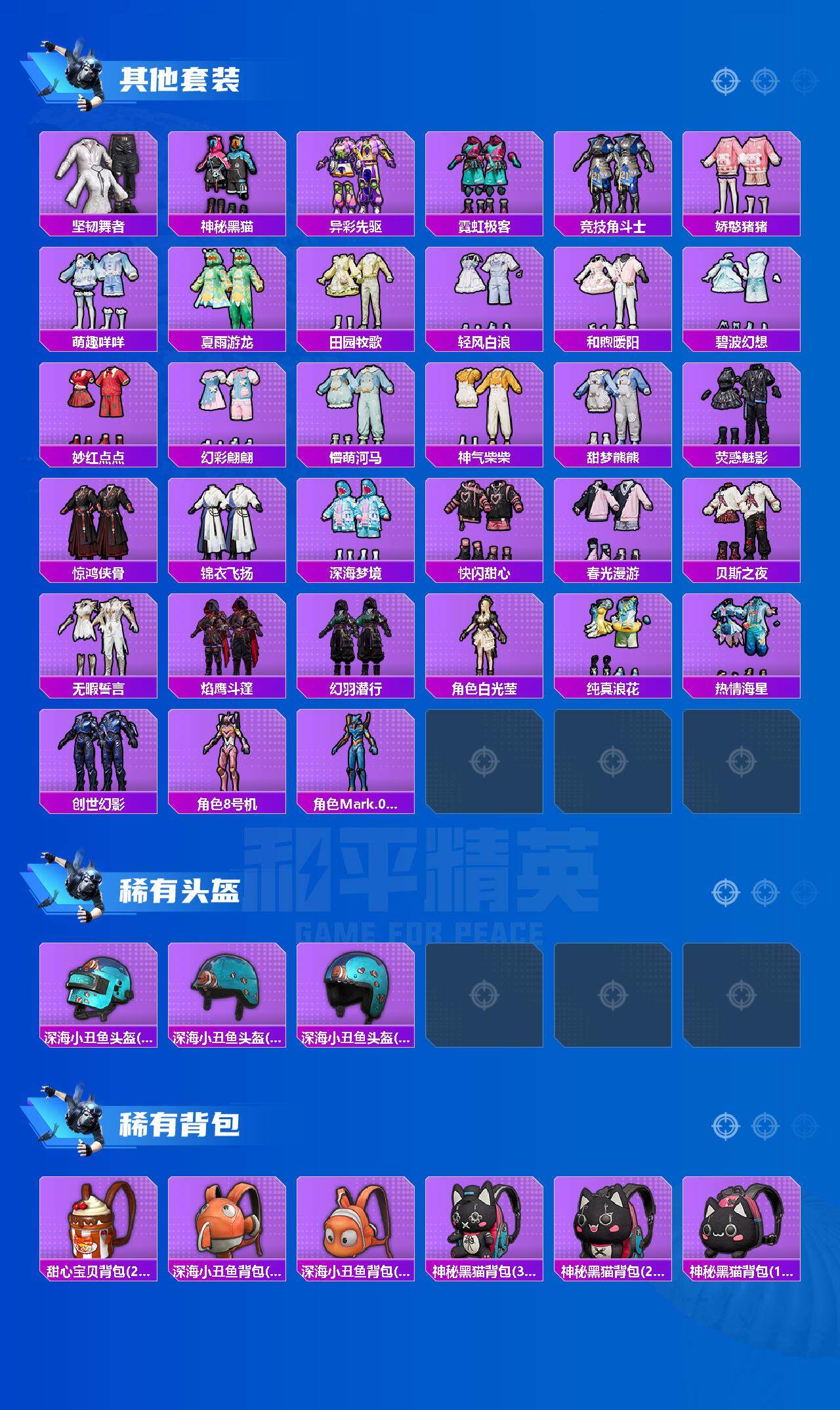 【热门品类】:套装-都市猎人,套装-小丑鱼,角色-忠真马岱,角色-忠义严颜,套装-龟仙人,套装-暗影哥特,套装-粉红小猪,角色-8号机,角色-Mark.06,大砍刀-青龙偃月刀