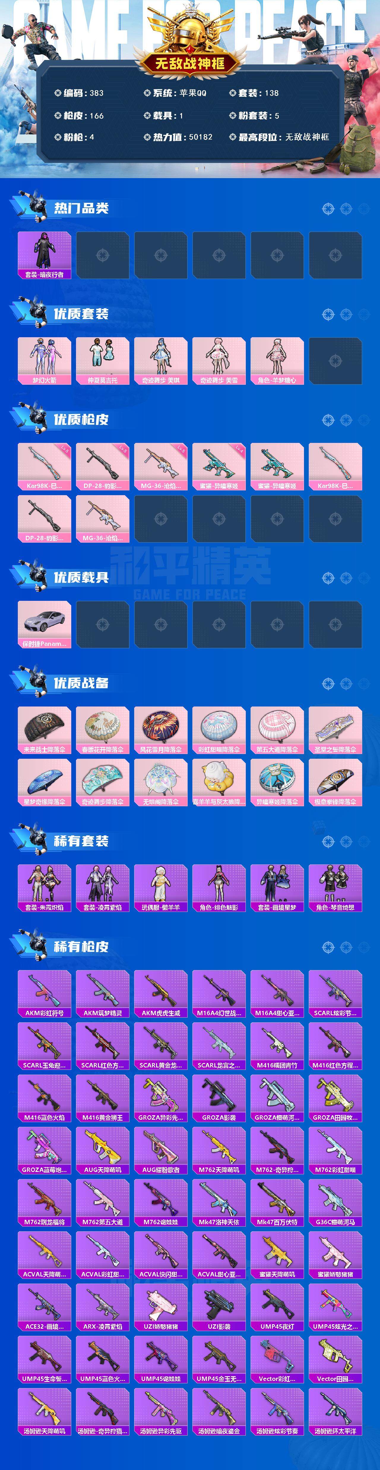 苹果 手Q-无敌战神框-5粉装-4特效枪-1载具-1粉色飞行器-50182热力值-8王牌印记-138套装-166枪皮