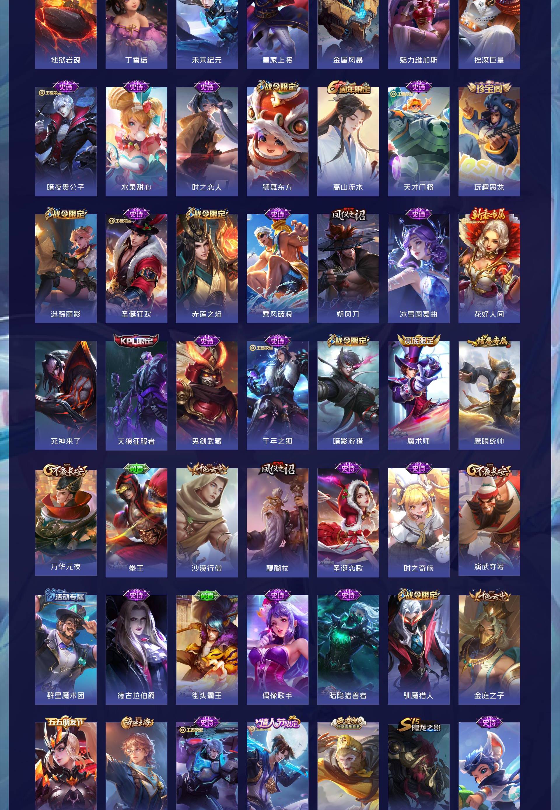 【限定皮肤】:狄仁杰阴阳师,赵云皇家上将,鲁班七号狮舞东方,庄周高山流水,高渐离玩趣恶龙,阿轲迷踪丽影,芈月幻夜卜梦,周瑜赤莲之焰,夏侯惇朔风刀,曹操天狼征服者,马可波罗暗影游猎,狄仁杰魔术师,狄仁杰万华元夜,达摩沙漠行僧,