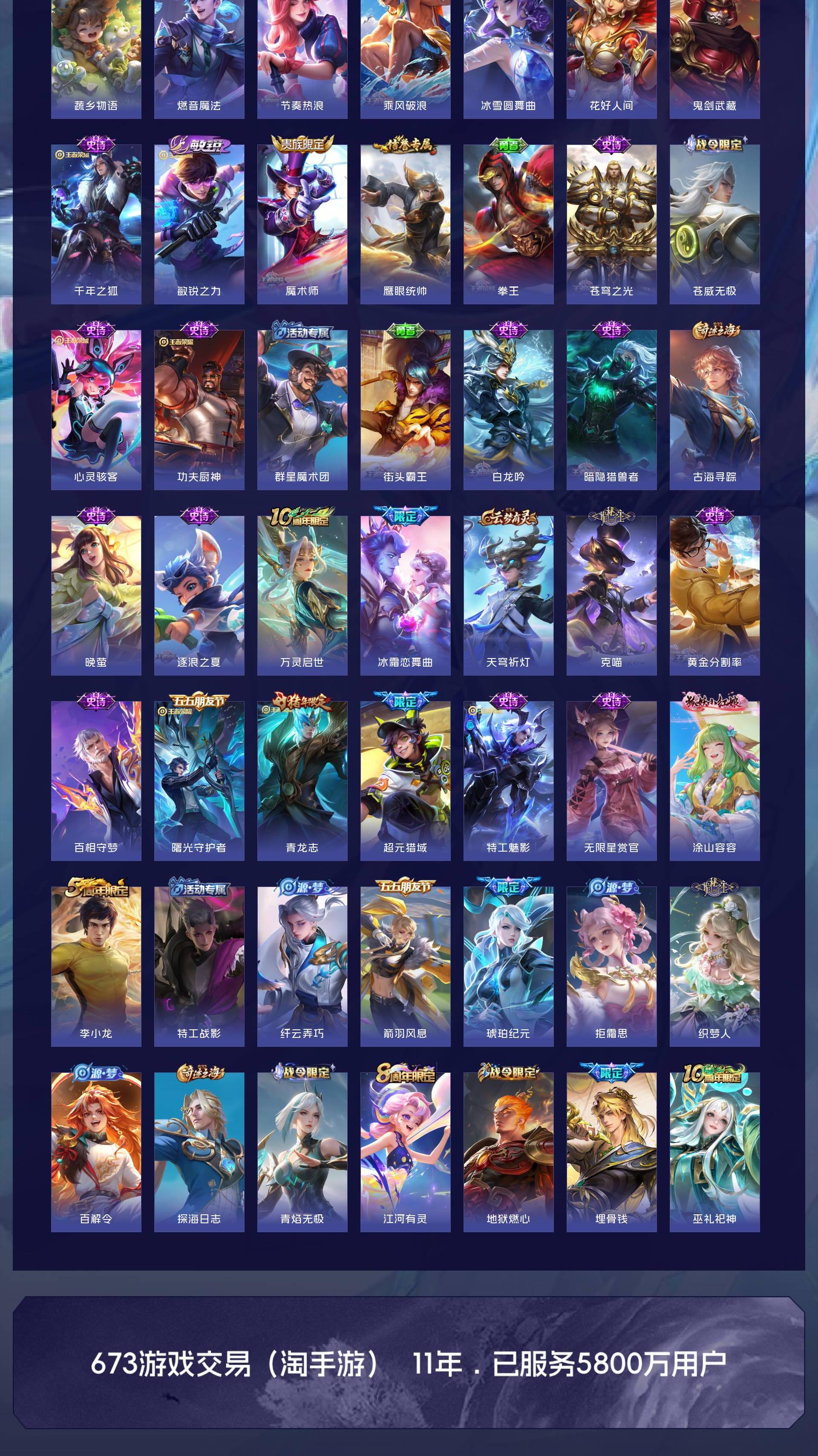 【传说皮肤】:杨戬纵目迁山,后羿神树通天,桑启鸣野蒿,夏侯惇霜北刀,孙策乘龙淬吴钩,铠琥珀纪元,澜逐花归海,马可波罗深海之息,孙策挚爱之约,曜李逍遥 ,曜云鹰飞将,李信一念神魔,刘备时之恋人,貂蝉仲夏夜之梦,宫本武藏地狱之眼,孙悟空地狱火