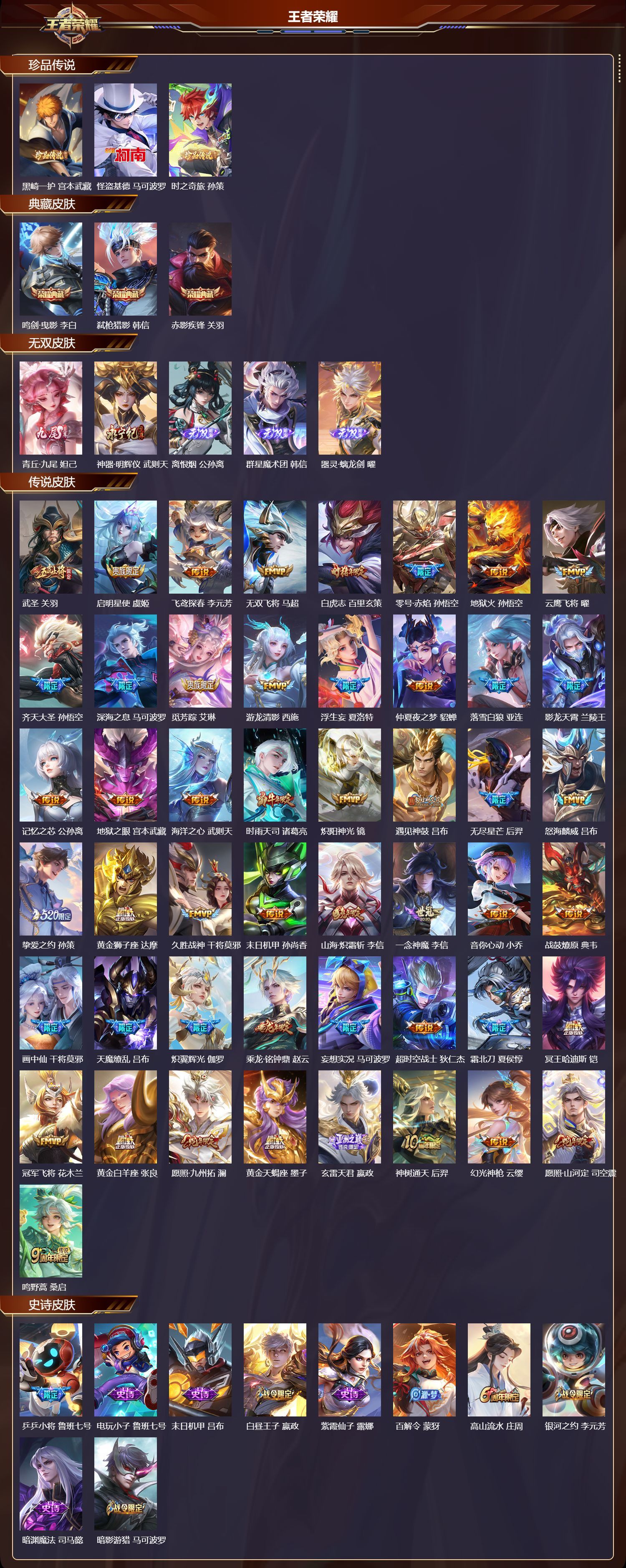 安卓QQ/至圣王者/468皮肤/128英雄/3典藏/0珍品无双/5无双/3珍品传说/49传说/132
