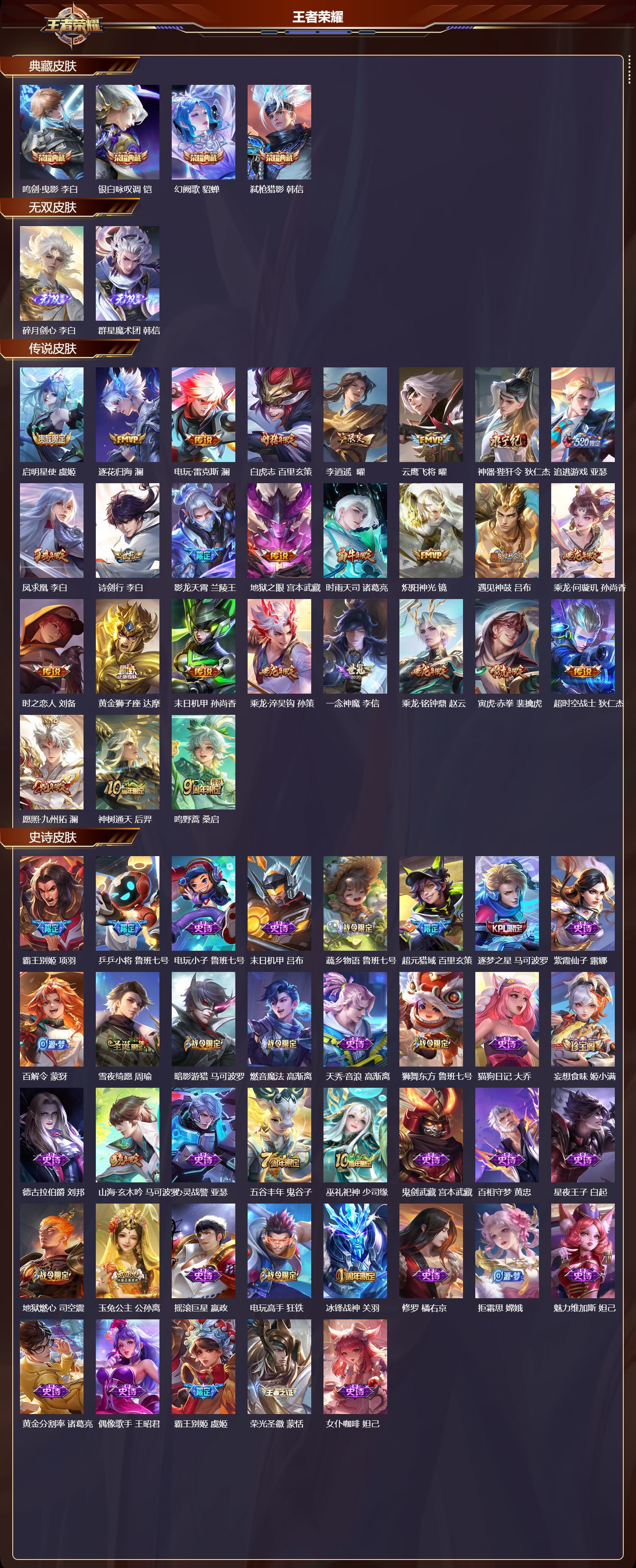安卓QQ/荣耀王者/387皮肤/127英雄/4典藏/0珍品无双/2无双/0珍品传说/27传说/119