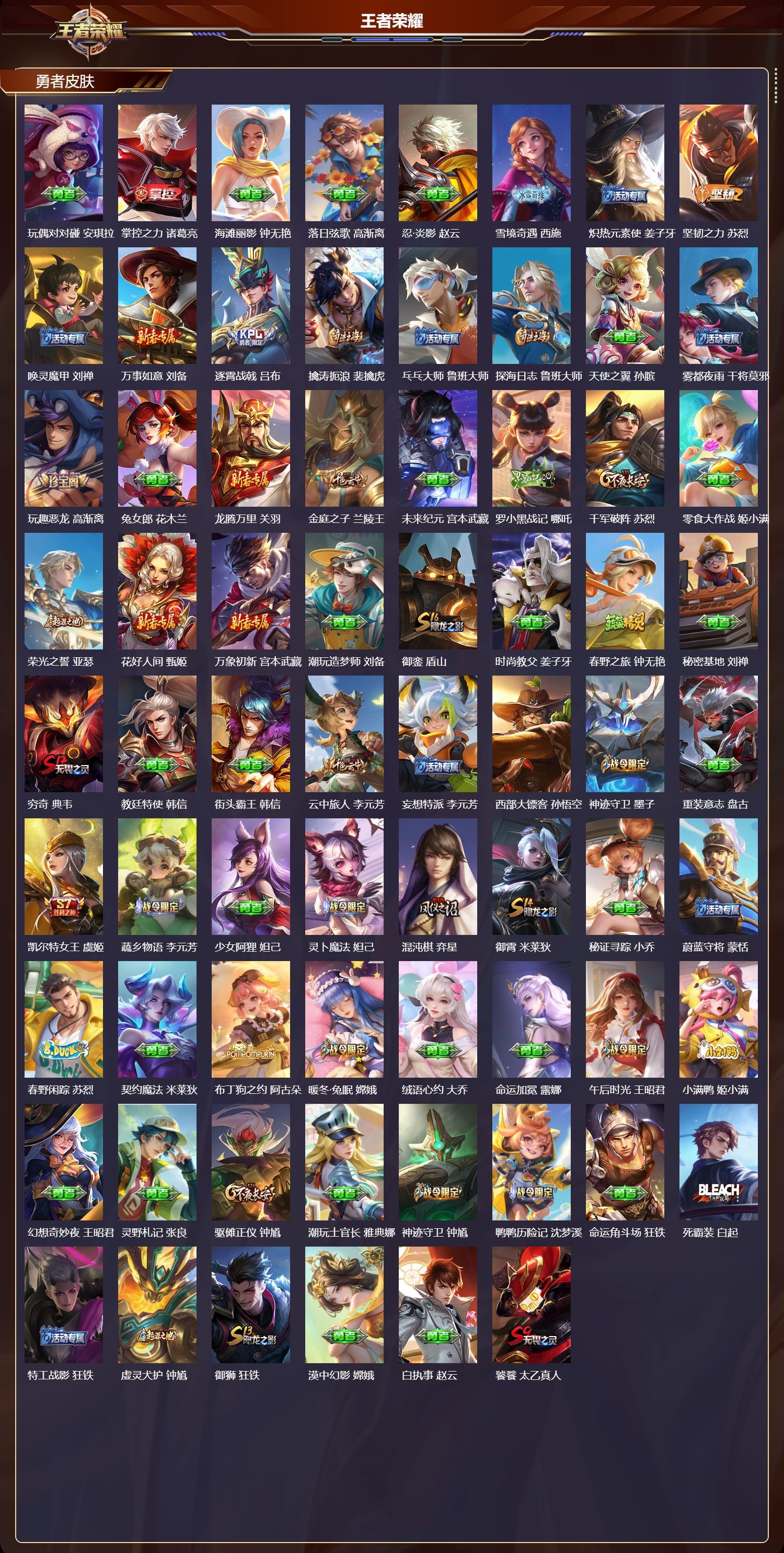 安卓QQ/传奇王者/463皮肤/125英雄/2典藏/1珍品无双/3无双/9珍品传说/45传说/13