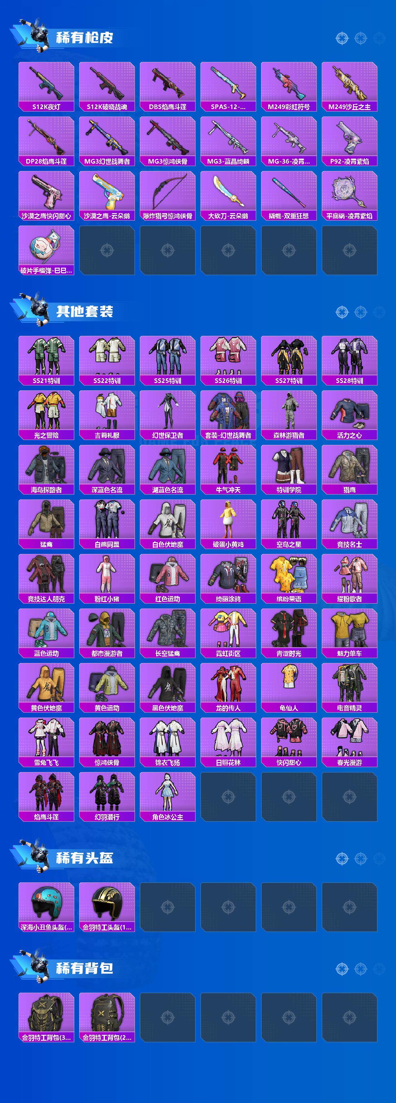【粉色枪皮等级】:GROZA-镜光银凌(五级),AUG-暖羊咩咩(五级),Vector-绯穹魔姬(七级),汤姆逊-热量炸弹(五级),Kar98K-巳巳如意(五级),Mk14-甜梦熊击(五级),Mk14-爆裂游戏(七级),DP-28-豹影疾电(五级),MG-36-沧焰双生(五级)