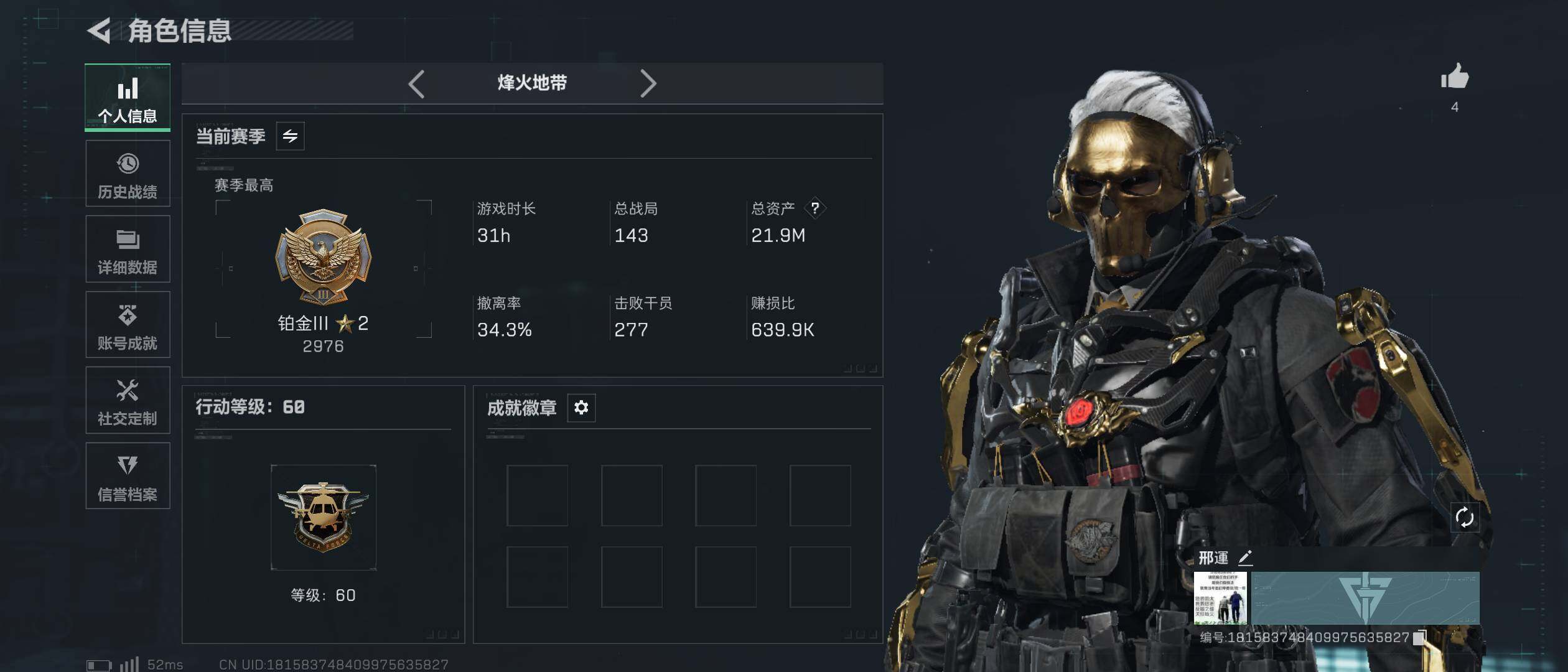 21m总资产-38k哈伏币-60烽火等级-铂金-25战场等级-军士长【干员外