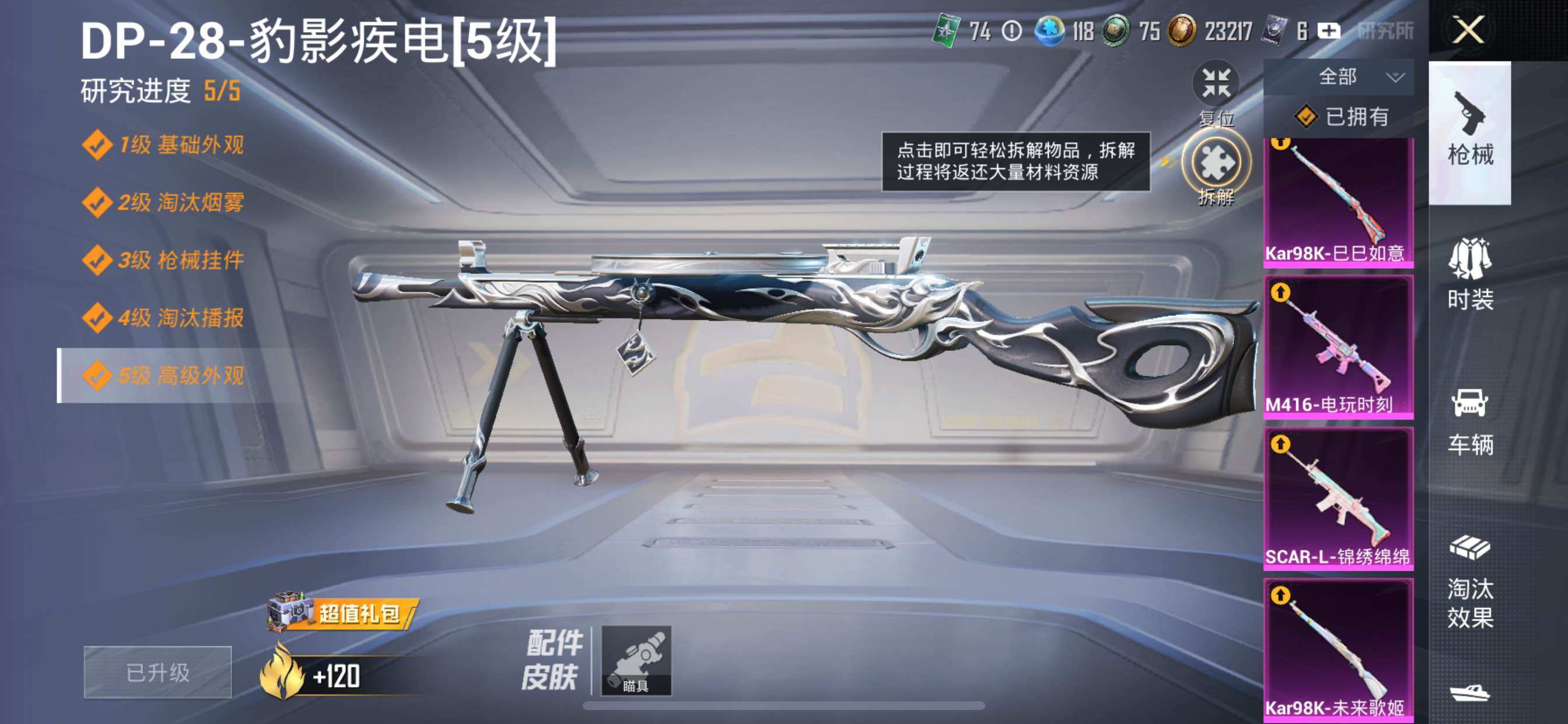 【粉色枪皮等级】:SCAR-L-锦绣绵绵(五级),M416-电玩时刻(五级),Kar98K-未来歌姬(七级),Kar98K-巳巳如意(五级),DP-28-豹影疾电(五级