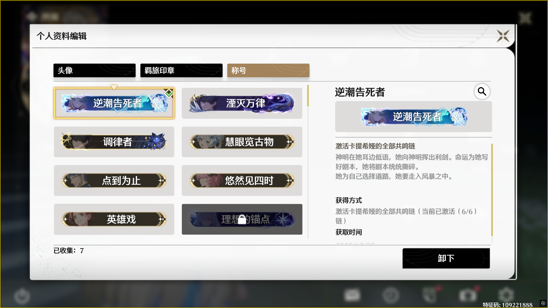 UID109开头 联觉等级80忌 地图惶珑满探索 黎那汐塔探索度百分之90 00忌炎 00守岸人 0