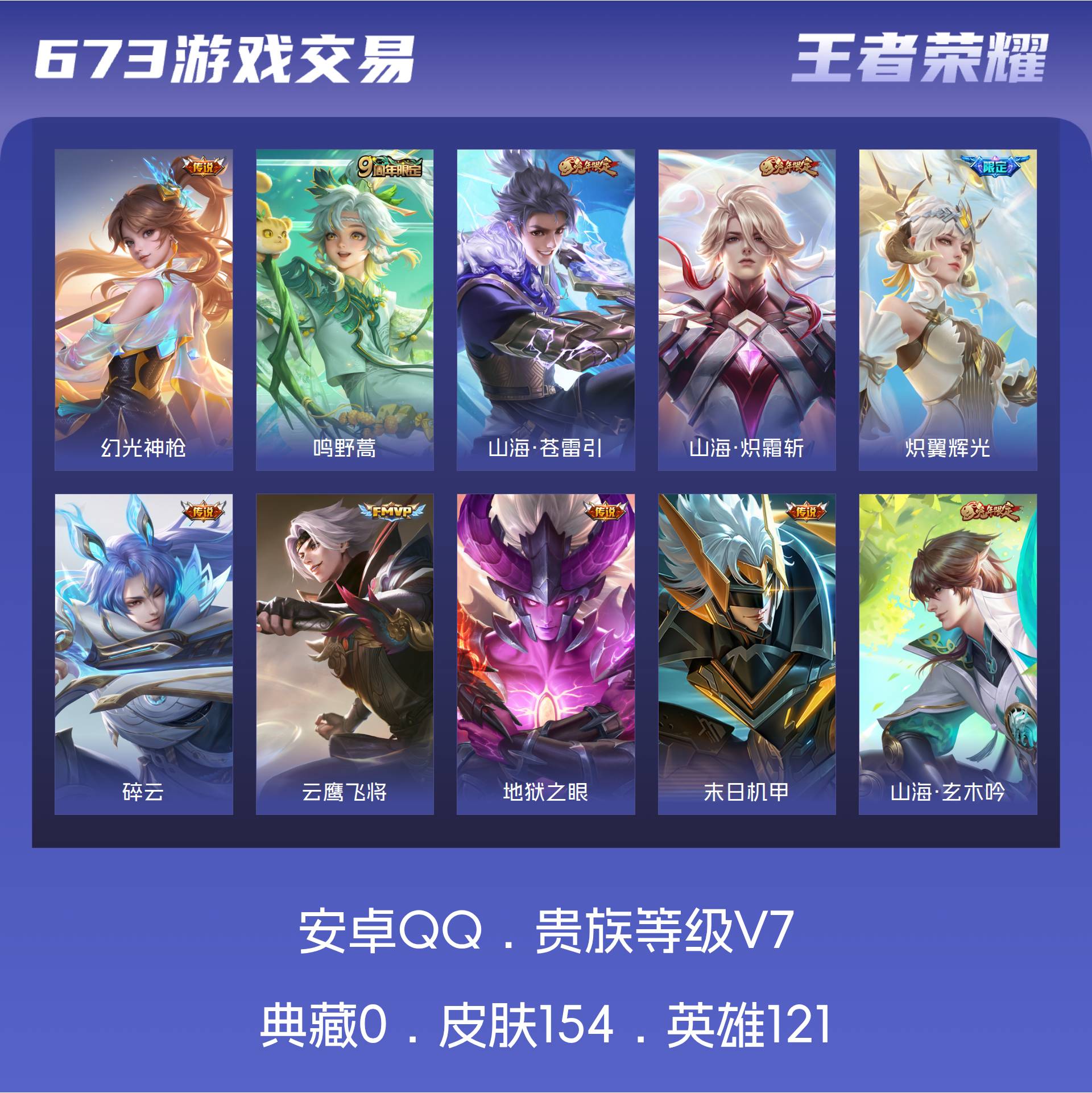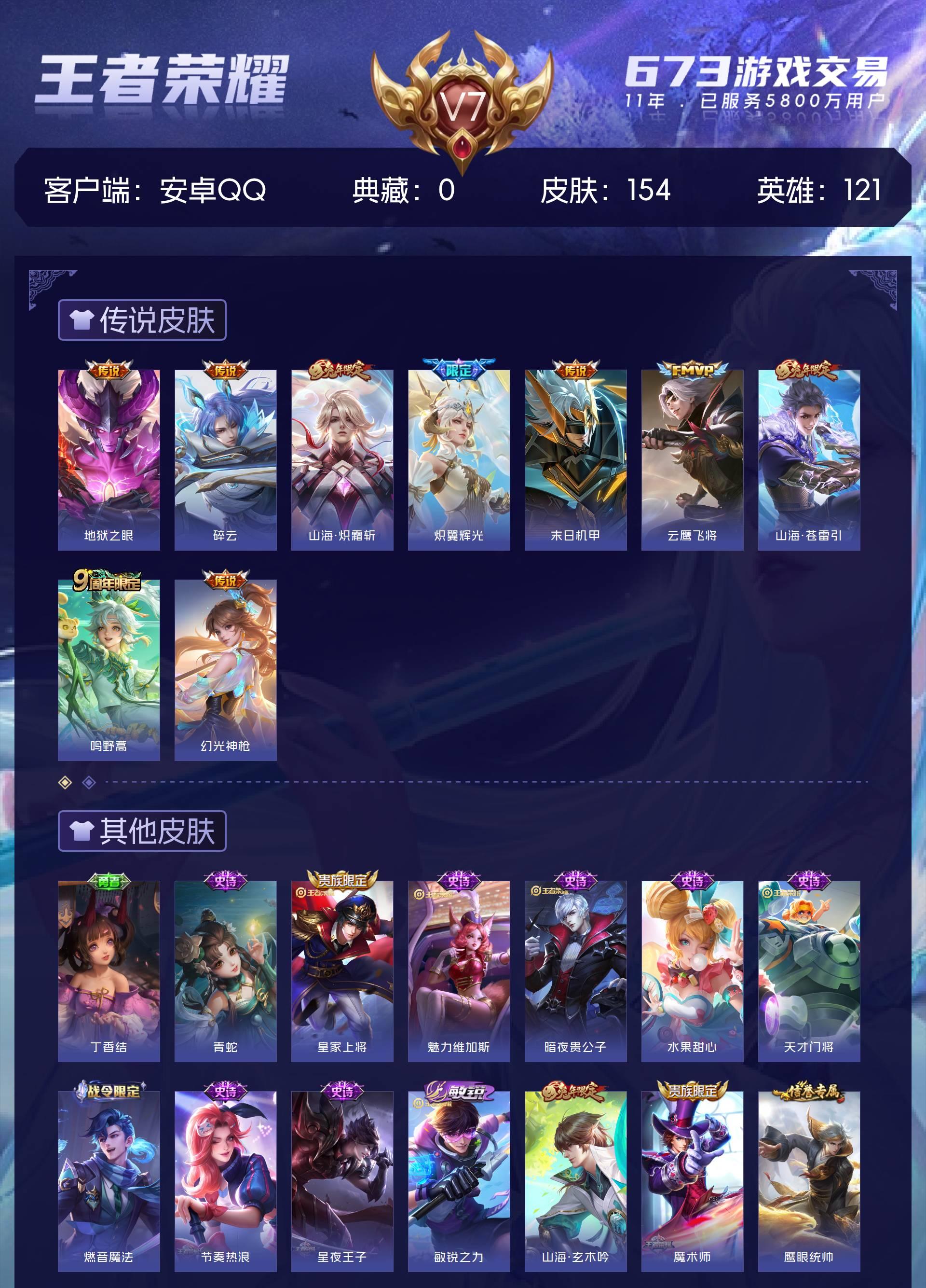 329-【9传说 154皮肤可秒换绑】安卓Q-121英雄【9传说】鸣野蒿 炽翼辉光 幻光神枪 地狱之眼 山海·苍雷引 山海·炽霜斩 碎云 末日机甲 云鹰飞将【32史诗】龙之律动 百相守梦 石田雨龙 星界游侠 群星魔术团 山海·玄木吟 青焰无极 魅力维加斯 魔术师 鹰眼统帅 圣诞恋歌 水晶猎龙者 天才门将 紫霞仙子 月团寄思 暗渊魔法 猫狗日记 水果甜心 苍穹之光 青蛇 心灵战警 暗夜贵公子 纤云弄巧 乱世虎臣 皇家上将 五谷丰年 滕王阁序 千筹问战 电玩高手 赏金猎手 节奏热浪 星夜王子【62勇