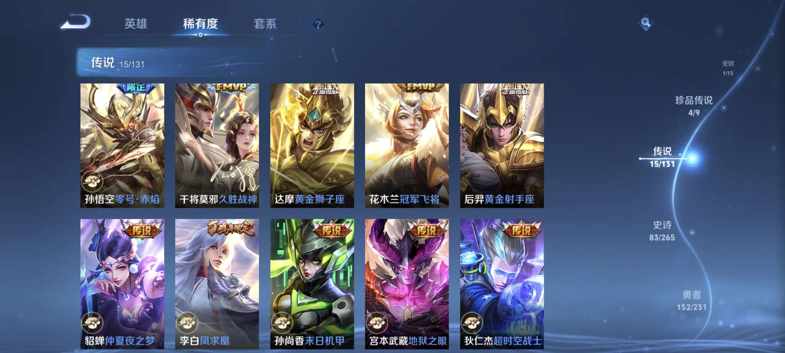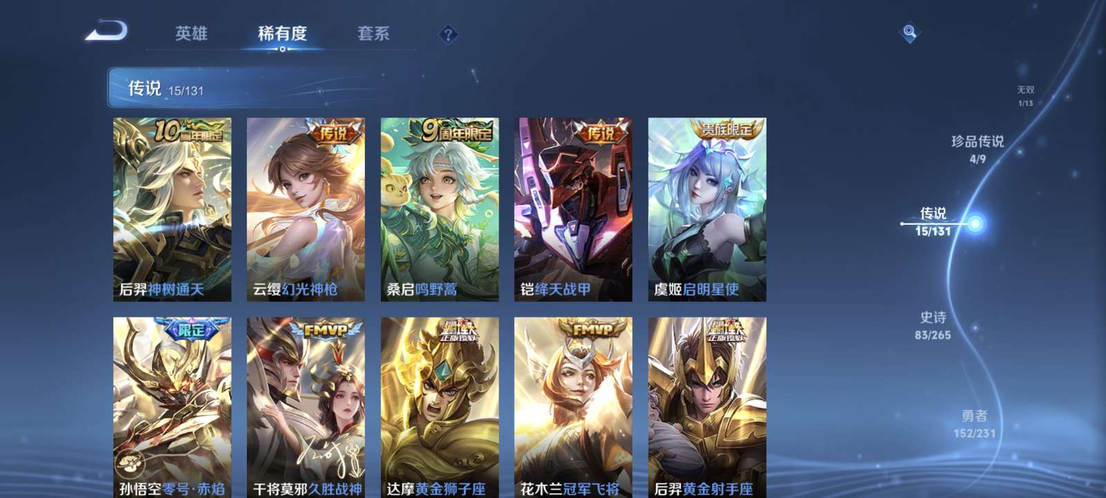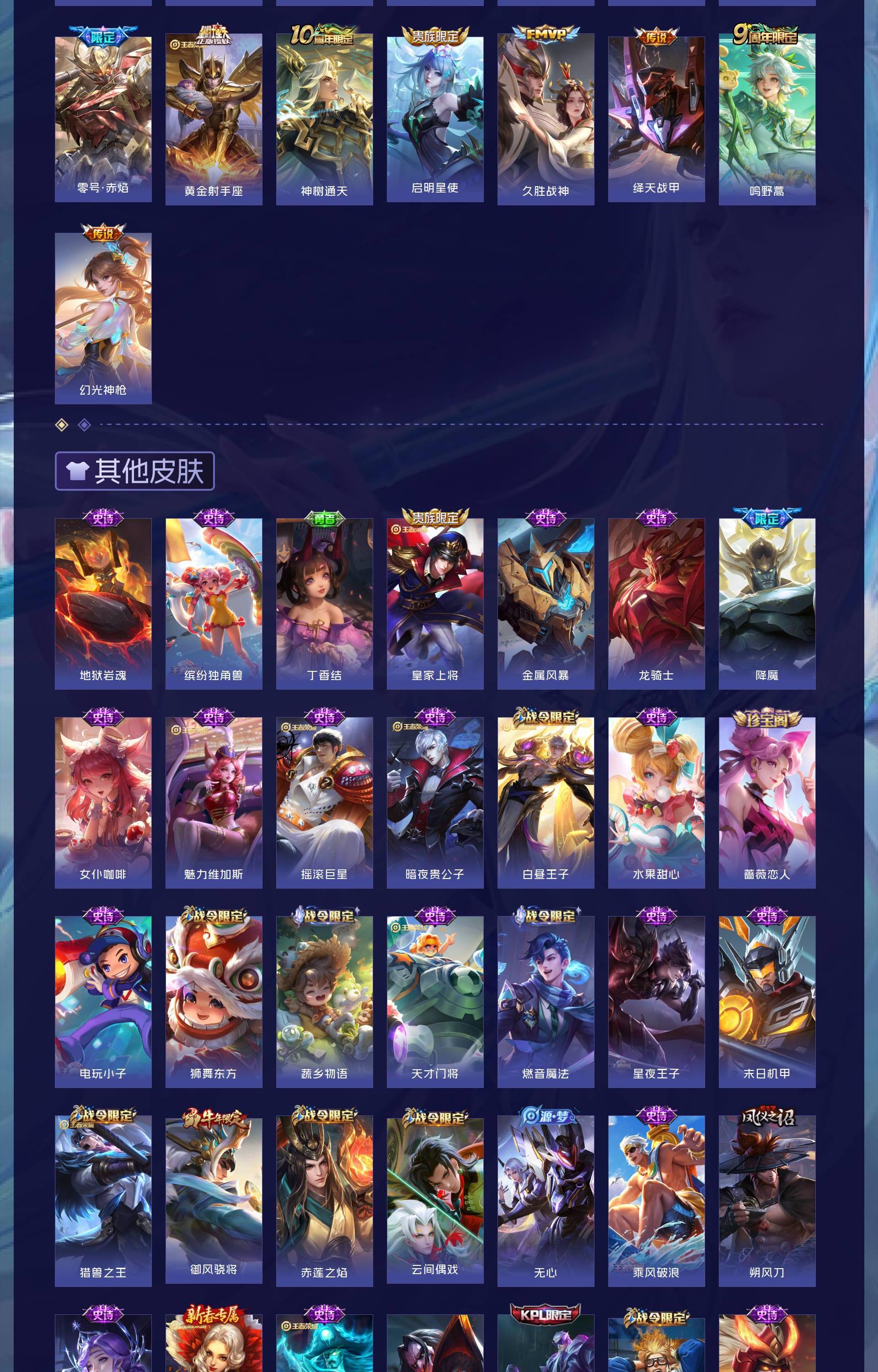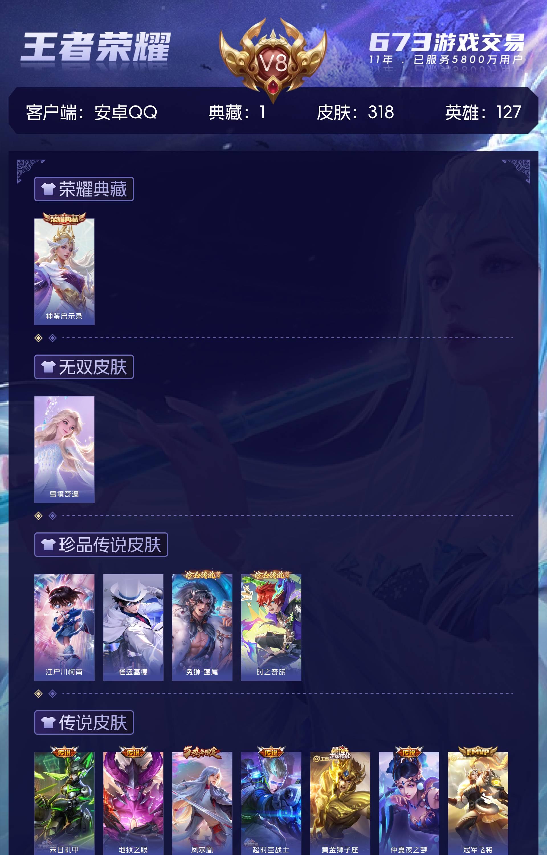 V8 皮肤318 英雄127 荣耀王者 荣耀典藏1 无双皮肤1 珍品传说4 星传说2 传说15 其他皮肤115