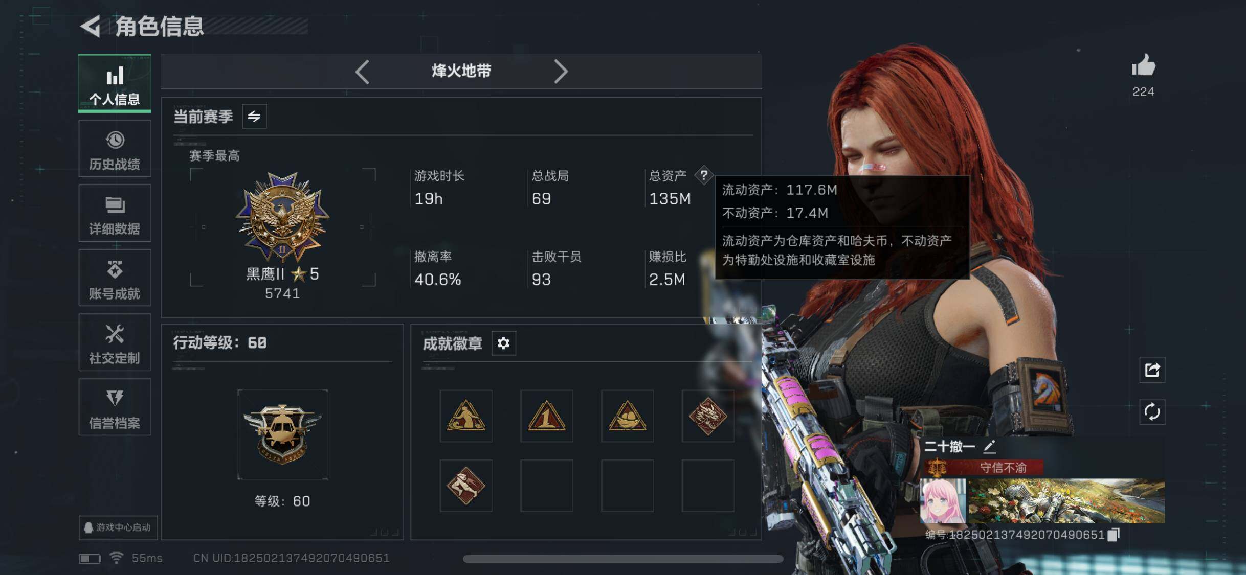 134m总资产-13029k哈伏币-60烽火等级-黑鹰-20战场等级-列兵