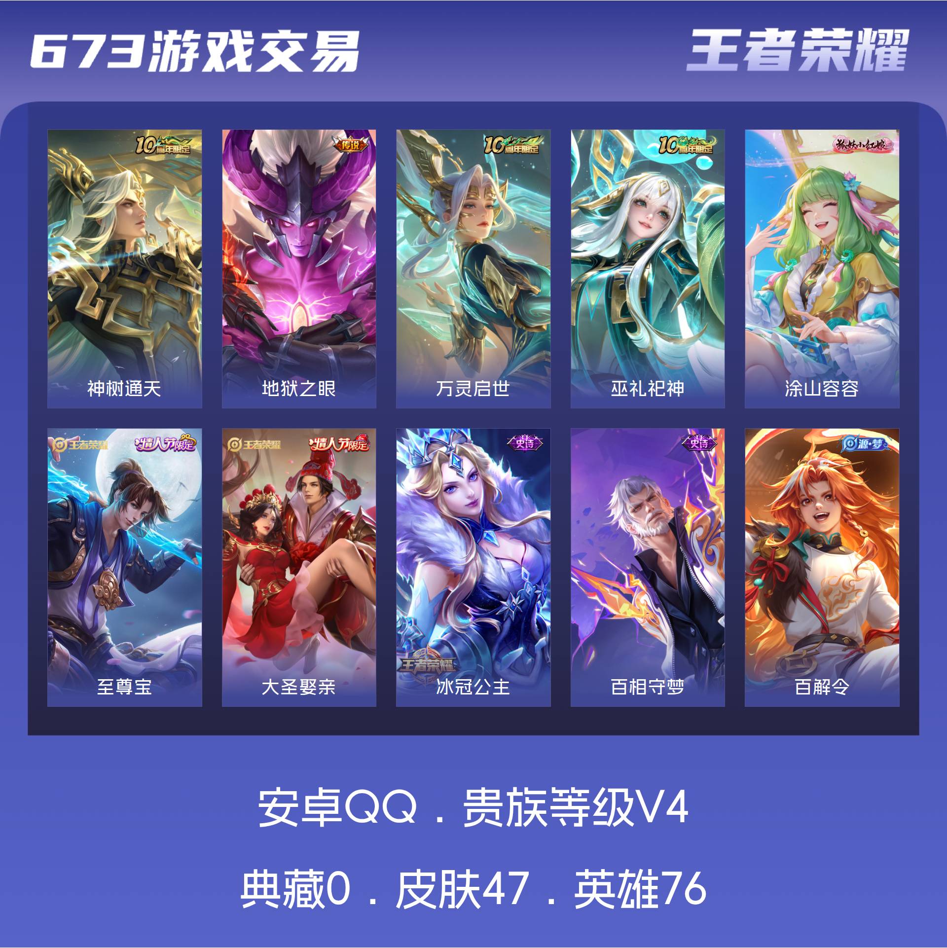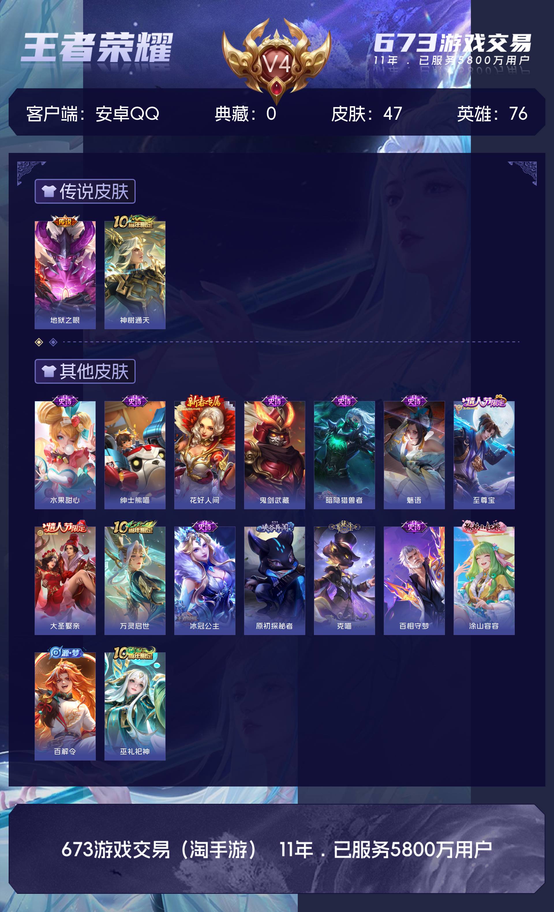 皮肤47 英雄76 非凡王者 传说2 其他皮肤16- 安Q-V4-47皮肤 76英雄 2传说 1星传说-幽冥之眼(可二次)【传说】神树通天 地狱之眼 1王者印记 15史诗 18限定