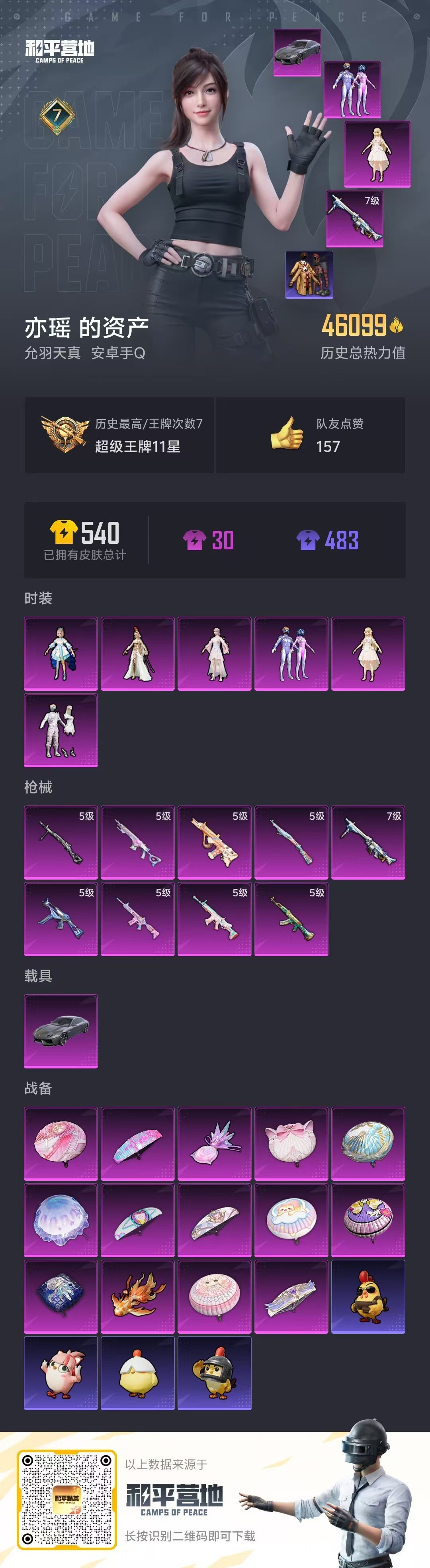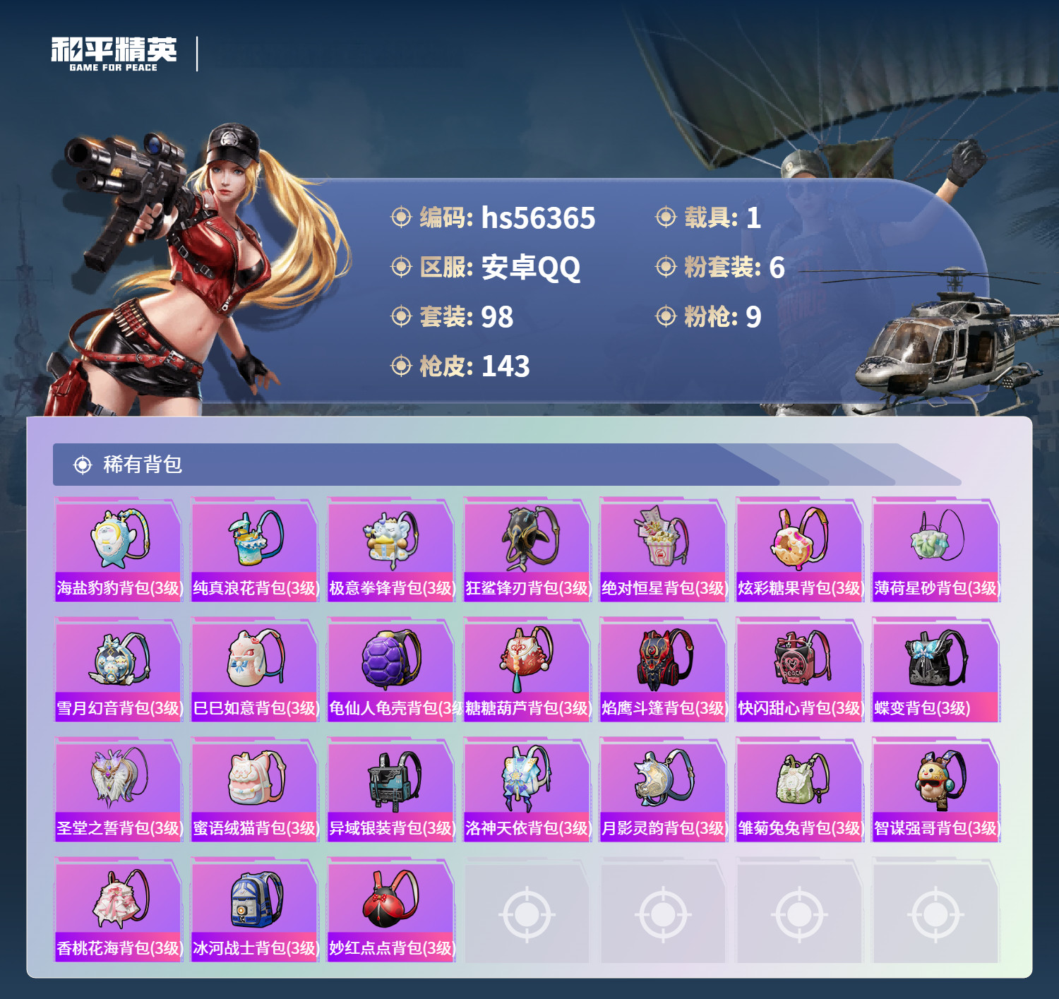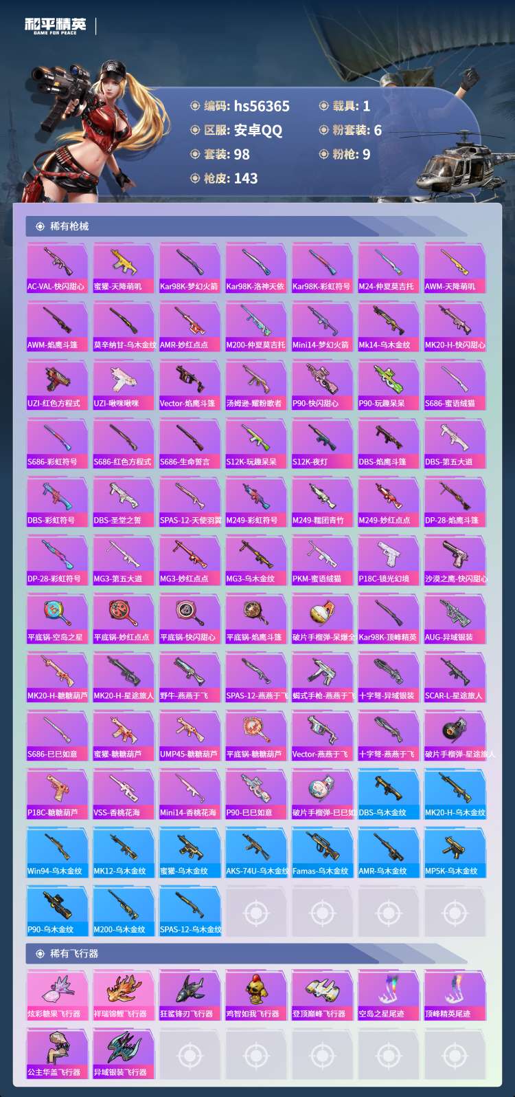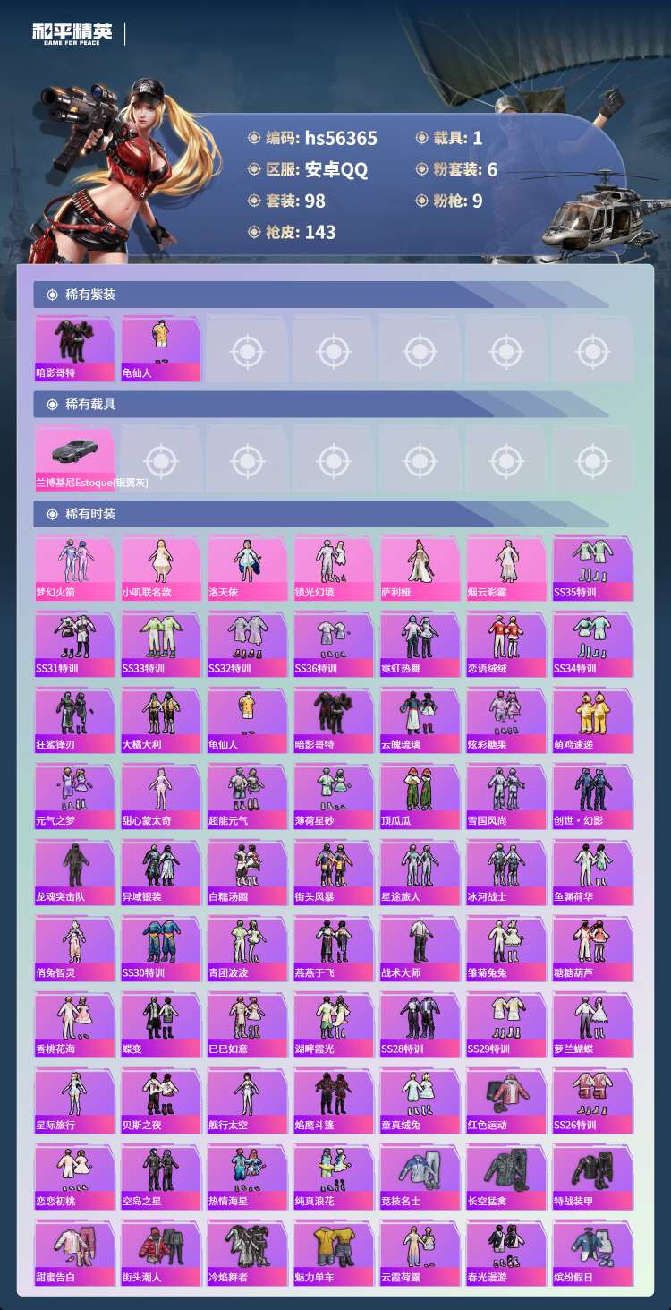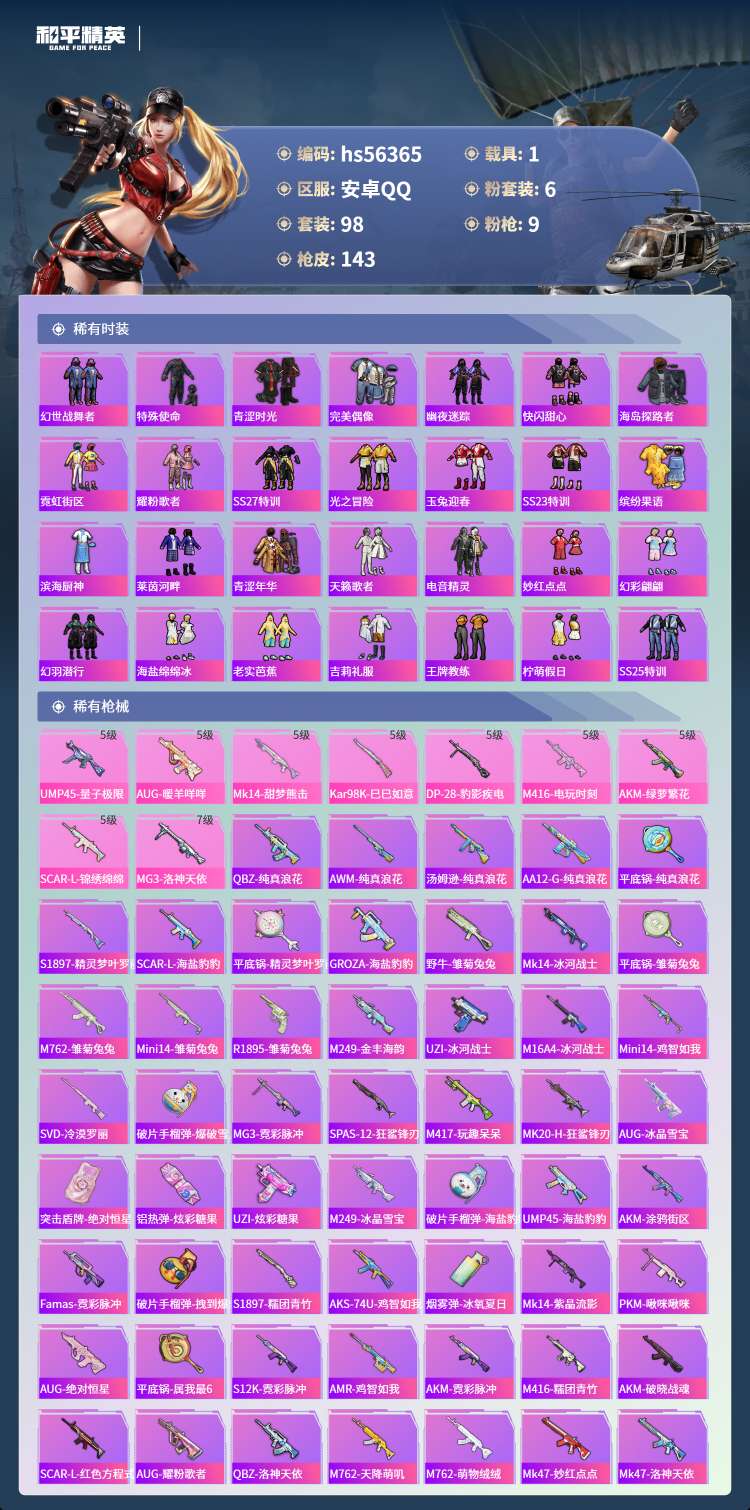 hs56365 安卓手Q-7王牌印记-6粉装-9特效枪-1载具-46099热力值-98套装-143枪