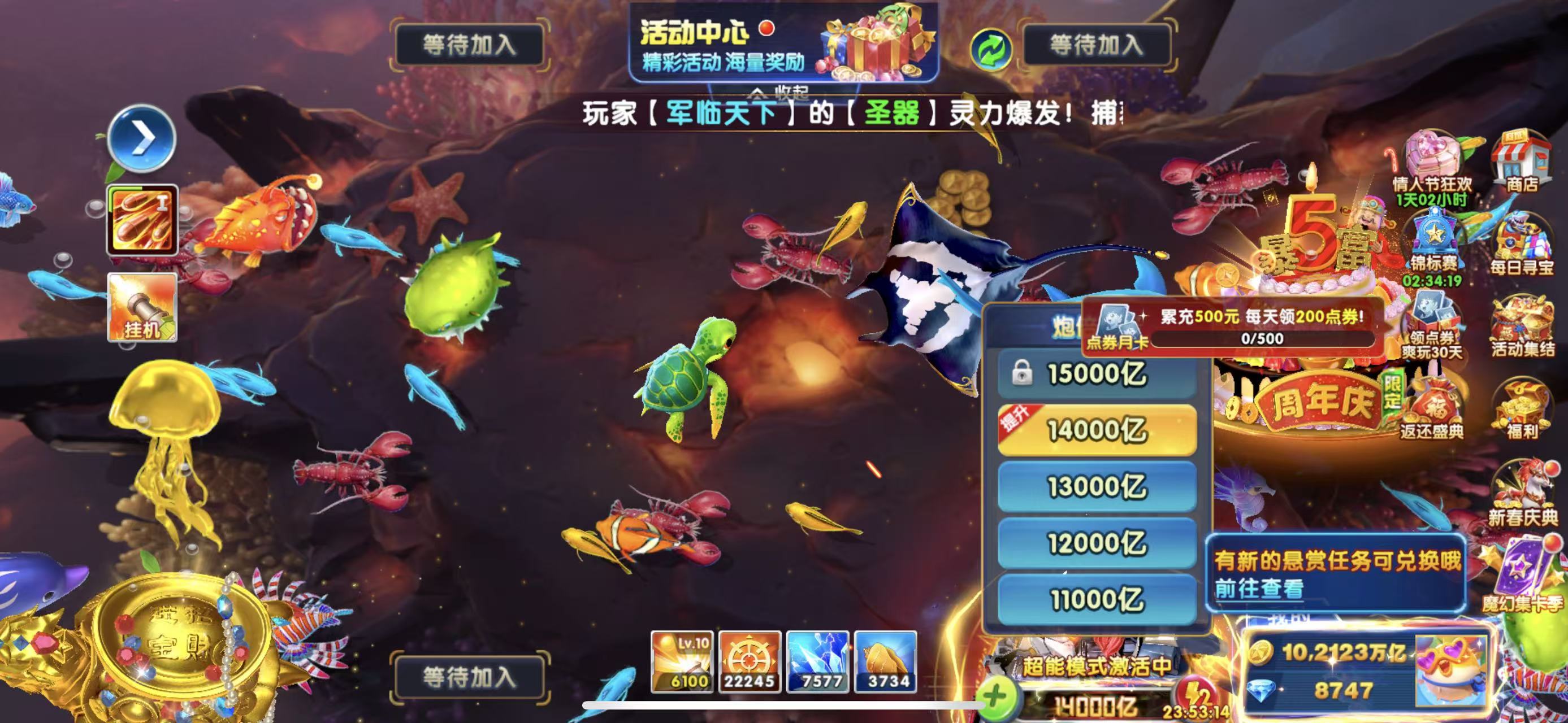 捕鱼大作战小米精品 0.1+号,1387 万亿,炮台 130,巅峰 30,破产号回 130,秒发货