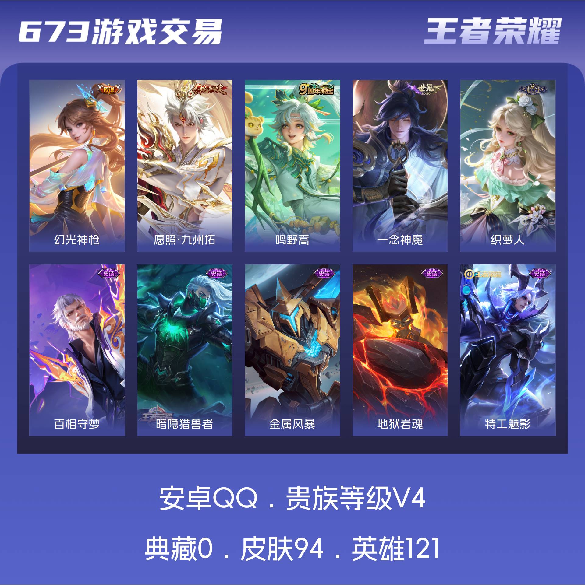35】安卓Q-V4-永恒钻石III段位-121英雄-94皮肤-4传说-25史诗