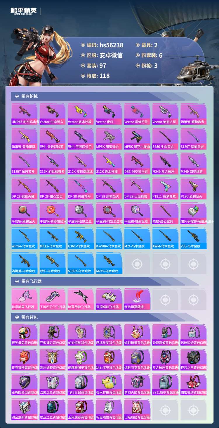 hs56238 安卓微-6王牌印记-6粉装-3特效枪-2载具-46800热力值-97套装-118枪