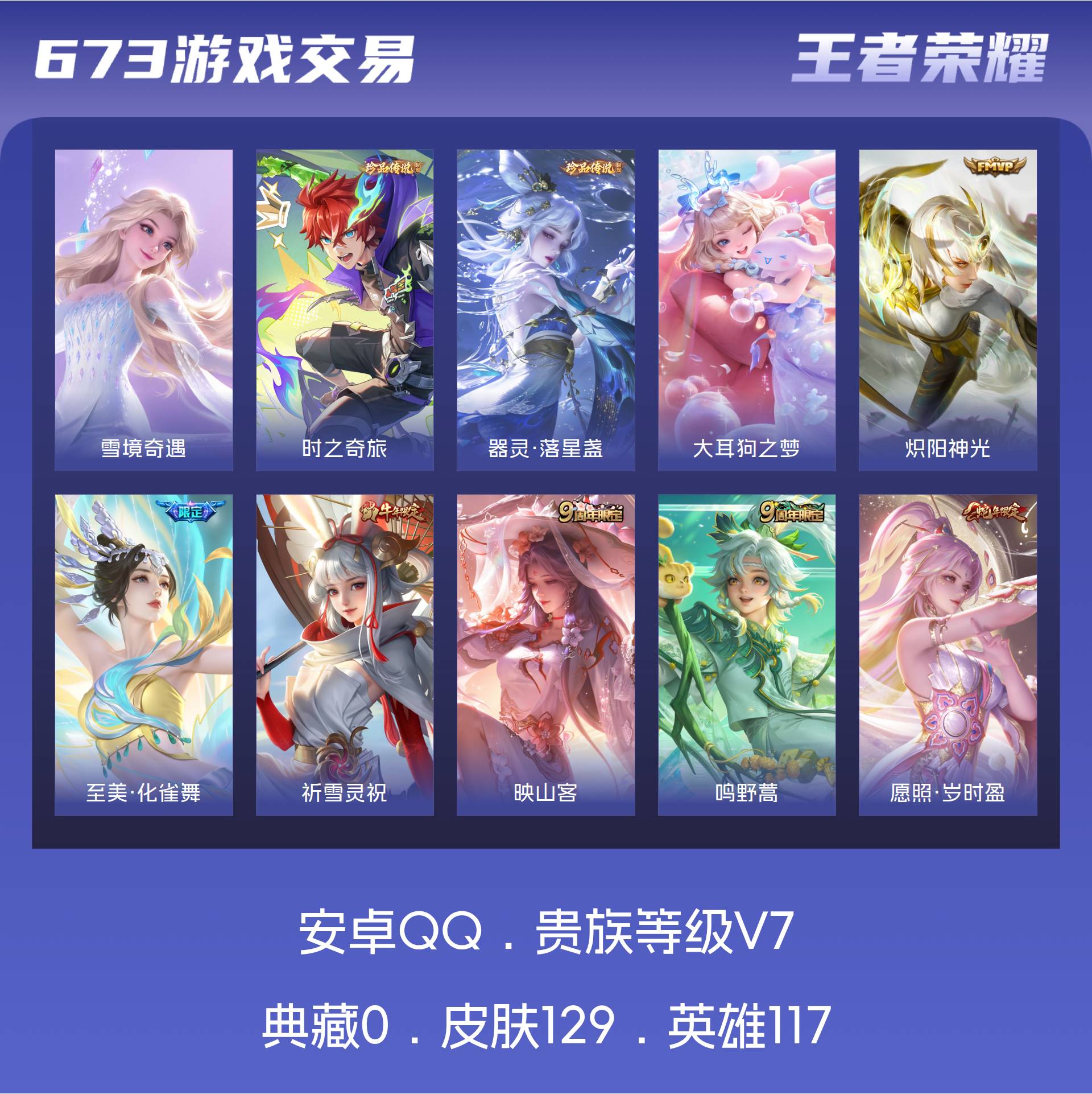 皮肤129 英雄117 永恒钻石 无双皮肤1 珍品传说3 传说10 其他皮肤48-GT118 级品女号