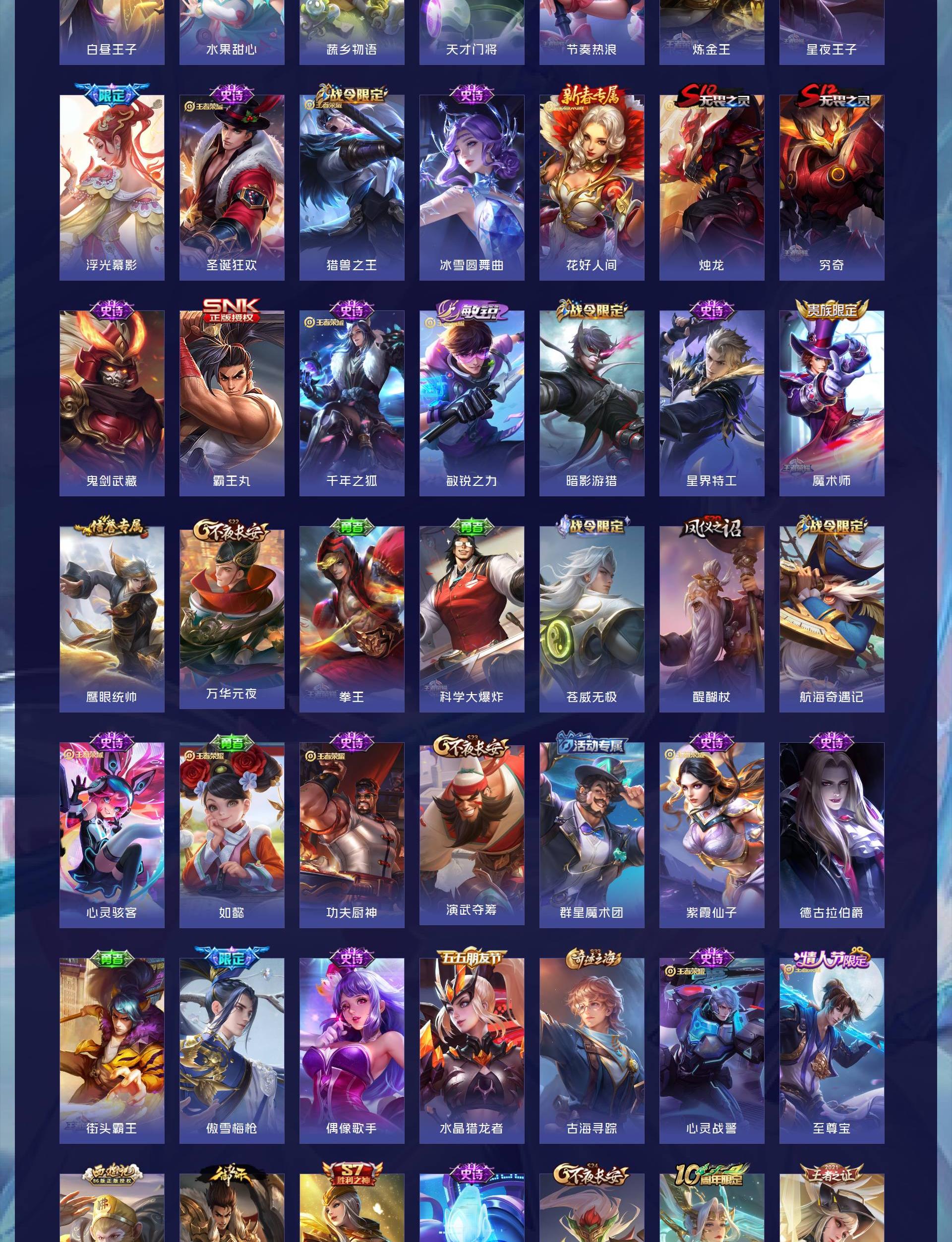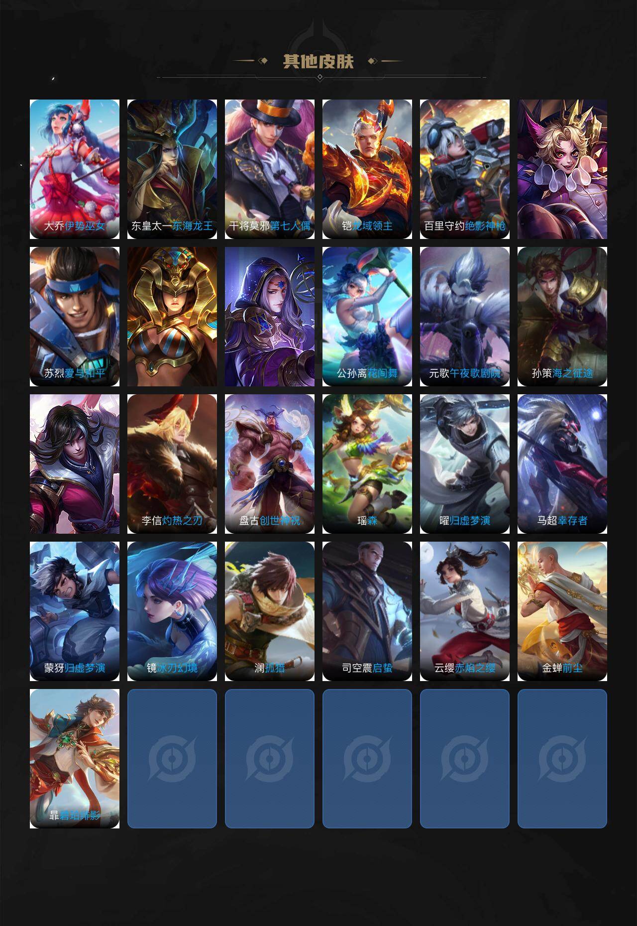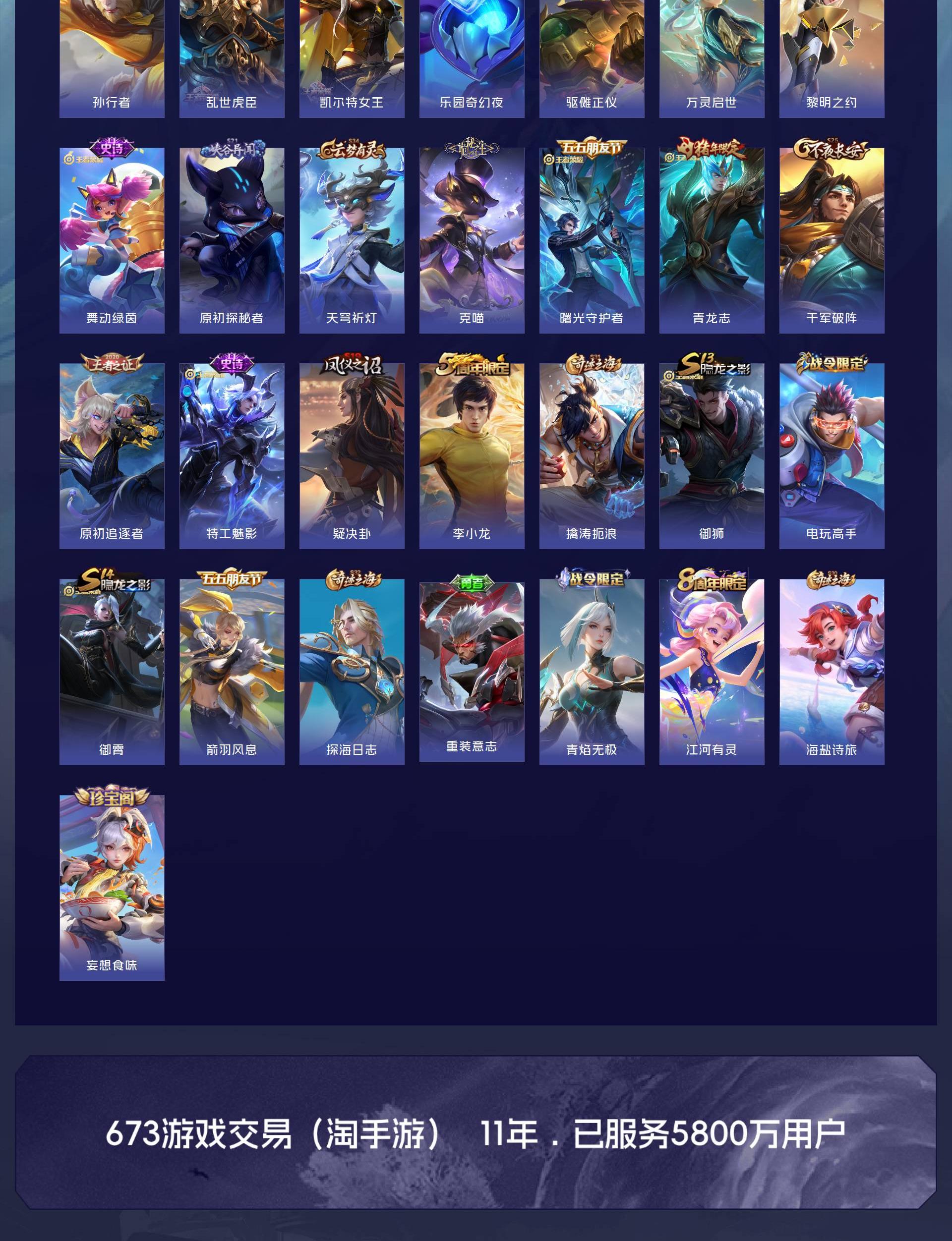 【传说皮肤】:后羿神树通天,司空震愿照山河定,澜愿照九州拓,云缨幻光神枪,桑启鸣野蒿,马超无双飞将,裴擒虎寅虎赤拳,诸葛亮时雨天司,干将莫邪久胜战神